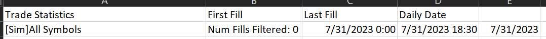 1. Go to Trade Activity Log >> Statistics with trade data present 2. Select Edit >> Copy All 3. Paste the data in a spreadsheet program Observe that the First Fill's data field does not contain the date/time of the first fill. Instead, it contains "Num Fills Filtered: 0". |