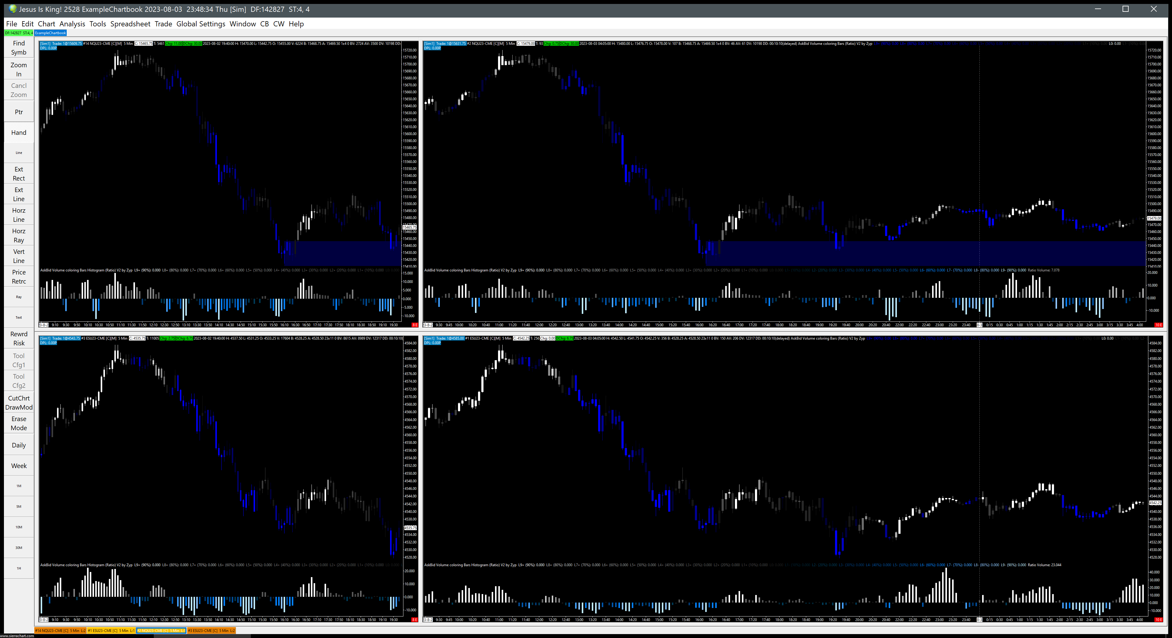Hello, Is there a way for one set of Linked Charts to still be Linked to another set of Linked Charts? Specifically: Is there a way to have several charts Linked in Link Group 1 (Higher Time Frame Charts - HTF), and have several other charts Linked in Link Group 2 (Lower Time Frame Charts - LTF), however, when moving the HTF Link 1 charts, the LTF Link 2 Charts would keep up or zoom to the same spot? I have workbooks set up as in the attached screenshot. On the Left Hand Side, the HTF charts are Linked together. I need them to stay linked by period, vertical and horizontal scrolling. Likewise, on the Left Hand Side, the LTF charts are Linked together and need to stay in sync. When I move the HTF charts, I'm looking for a way for the LTF charts to keep up and give me a sort of zoom view into the price action details. https://www.sierrachart.com/image.php?Image=1691106515683.png Thank you for any guidance, Mike |