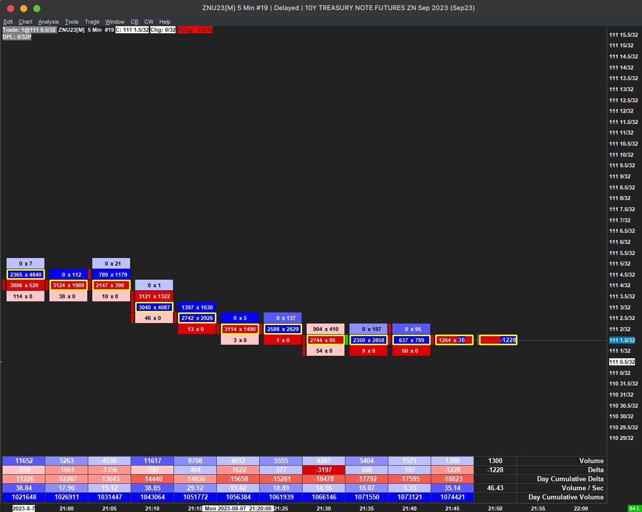 Good morning / Good afternoon, I want to create a bar number chart for different markets, ZN, ZB, UB, FGBL, GC, ES, and CL, where (In:16) is Bid Vol x Ask Vol, (In: 17) Full Background, (In: 18) Based on Ask Vol Bid Vol Difference - Acutual, and (In: 18) equal. To be correct the information shown, depending on the market, Column 1 Actual Volume Compare Thresholds (In: 112) affects it, because the default values of 100, 200, 300, are not the same in the markets mentioned before, since the average maximum delta, of the cash session, is different for each market. The question is, how to calculate the maximum average delta of the cash session, of the ZN, ZB, UB, FGBL, GC, ES, and CL, so that the bar charts look like the attached image, and the information on the chart is correct. Can it be that this data of the (In: 112) is calculated automatically? Thank you. |
