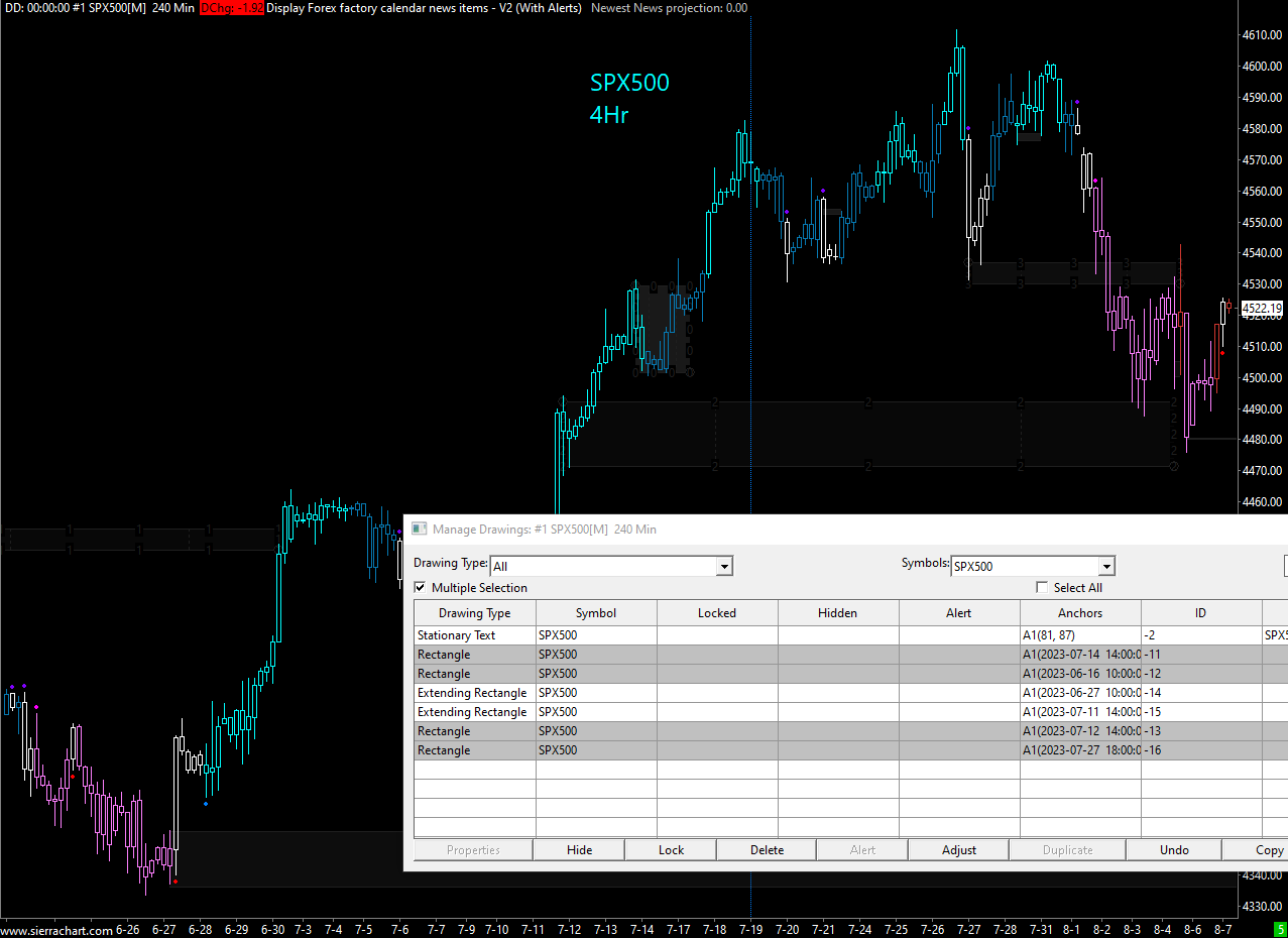 Add My vote to the wish list - I am one of those that would benefit time wise with enhanced capabilities of the Manage Drawing Window. And to keep all thought in one place... (since there were no replies, I'll repost text vs the link to forum) Below is what I started in another post. ... During my trading day, I have 6 charts - 3 time frames -- each 1 footprint & 1 candle stick. 6 total. I draw arrows, lines and annotate with text throughout the day. Many times I want to share that drawing to other charts. Sometimes only one specific object, sometimes I want to add/remove all of an object type. Or share/remove or hide all objects created in a specific timeframe, but leave the others. (Ex. Remove all text & drawings from long time frame chart but not across all other windows. 1 - Drawing manager window is across the entire chartbook - requiring a new column -> Chart #. 2 - Hide individual shared objects through Mgr window and ACSIL. Including the ability to hide an object on the created chart, but stay visible on other shared to charts. 3 - Allow individual drawing object sharing - with ability to specify which charts it is shared with. -- this requires ability to maintain sharing both on Drawing Manager as well as within ACSIL. -- this requires a new column, with multiple entries in it for 'Charts shared with'. -- an alternative better method would be to have a column for each chart #. this combined with the ability to sort on any column, gives me, the user complete flexibility in what I want to accomplish. - Ex. hide all text items shared with me, just sort on shared with chart # column, then if a 2nd level sort were available, sort on object type, or select at the top of the window, text objects only 4 - Make multiple selection automatic - more like the rest of the interfaces we are used to. Just click on a checkbox, on each line, or use mouse drag. Then be able to right click, and select action from a popup/dropdown menu. This would be much less mouse movement. Also allow keyboard movement up/down the list of items and pressing spacebar to select/un-select an item. The ultimate would be the ability of the Drawing Manager window to be more like a rubics cube, with the ability to have 2 levels of sorting on any two columns. How do others use SC and drawing objects? I am just trying to be more efficient. |