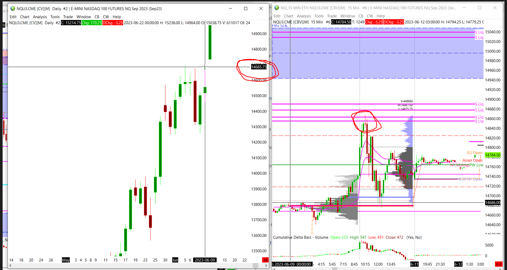 Hi there, as a long time user I do read through the instructions before I post here. Thanks for the link but to me it is not helpful. I attached another screenshot, please have a look. Could it be that it is a glitch within the platform? I pulled up an intraday day chart for June 9. The intraday chart shows a high of day at above 14860. When I look at the historical daily chart however, the high comes in at 14685.75, so it is a whopping 200 points off. Since trading view displays the high of day equally for an intraday chart and a historical chart I really dont understand why it is different in Sierra Chart. Especially since the historical chart should display all data for the trading day, accoording to your documentation, I dont understand why the actual high is not included |