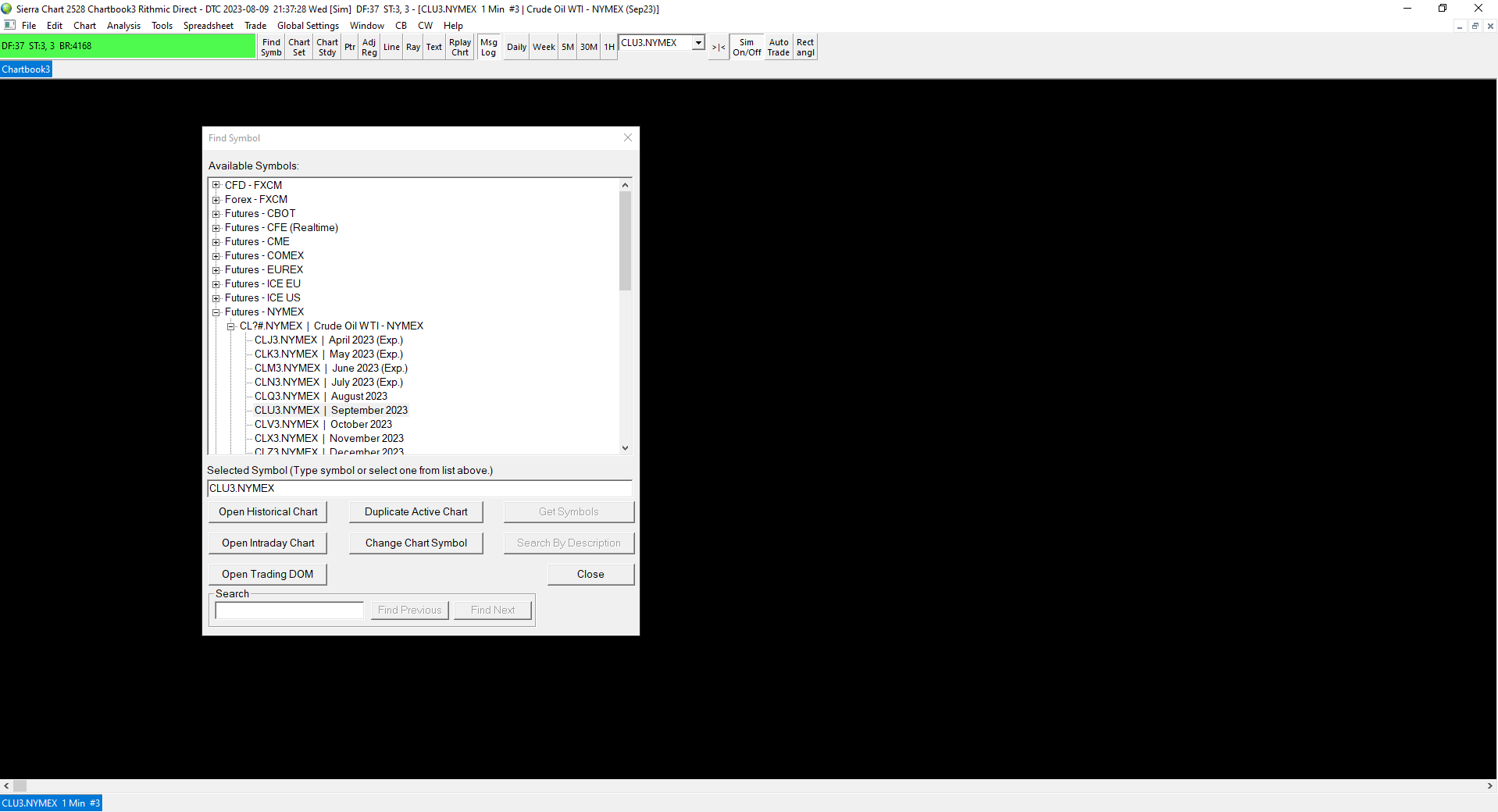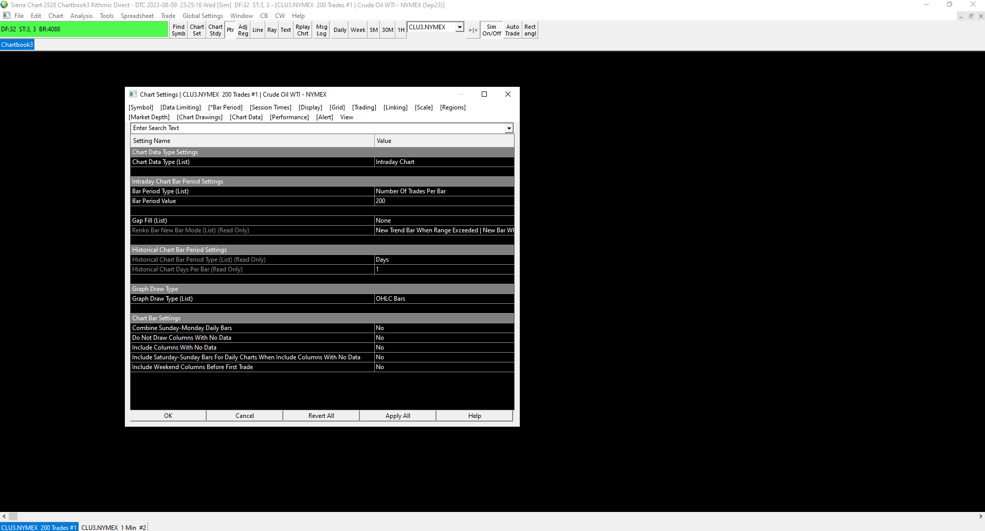 Hello John I have followed all the steps religiously but no data on chart, neither live or historically. The Steps I followed are: 1. opened a live funded account with AMP 2. Signed Denali agreement and subscribed to live data 3. Add Rhythmic/Apex username and password for just Trading and left Market Data and Historical Data empty 4. Opened existing chartbook and clicked Edit>>> Translate Symbols to Current Service 5. Made sure the chart showing the right symbol as per Rhythmic. The only thing that I have not done yet, I did not connect to the Teton CME Routing with my funded account in the Data/Trade Service Settings, even though I have already signed Denali agreement and subscribed to real live data. I still have the whole month to connect once, but do I need to connect it first prior to getting live data or it is not a condition to see the data? I have attached the chart settings for you to review and below are detail of the message log. I appreciate your help! Message Log: Software version: 2528 64-bit | 2023-08-09 21:27:33.331 Primary Thread ID: 14564 | 2023-08-09 21:27:33.331 Usage end date: 2023-09-01 | 2023-08-09 21:27:33.331 Enabled for: Advanced Features 2. | 2023-08-09 21:27:33.331 Enabled for: Sierra Chart Historical Data Service. | 2023-08-09 21:27:33.331 Enabled for: Denali Real-Time Exchange Data Feed. | 2023-08-09 21:27:33.331 Enabled for: Delayed Denali Exchange Data Feed. | 2023-08-09 21:27:33.331 Enabled for exchange2: CME (Trading Account Required) | 2023-08-09 21:27:33.331 Enabled for exchange2: CBOT (Trading Account Required) | 2023-08-09 21:27:33.331 Enabled for exchange2: COMEX (Trading Account Required) | 2023-08-09 21:27:33.331 Enabled for exchange2: NYMEX (Trading Account Required) | 2023-08-09 21:27:33.331 Enabled for exchange2: fairx_exchange.data | 2023-08-09 21:27:33.331 Enabled for exchange2: NASDAQ TotalView US stock data | 2023-08-09 21:27:33.331 Allow Support for Sierra Chart Data Feeds is enabled. | 2023-08-09 21:27:33.331 Current selected Data/Trading service: Rithmic Direct - DTC | 2023-08-09 21:27:33.331 Custom symbol settings values: enabled | 2023-08-09 21:27:33.331 Chart Update Interval: 500 | 2023-08-09 21:27:33.331 Intraday Data Storage Time Unit: 0 | 2023-08-09 21:27:33.331 Time Zone: -04:00:00 (EST-05EDT+01,M3.2.0/02:00,M11.1.0/02:00) | 2023-08-09 21:27:33.331 2023-08-10 01:27:33 Local computer time in UTC | 2023-08-09 21:27:33.331 2023-08-09 21:27:33 Local computer time in SC Time Zone | 2023-08-09 21:27:33.331 2023-08-10 00:52:45 Server time in UTC | 2023-08-09 21:27:33.331 Local computer UTC time and Server UTC time difference: 1 seconds. | 2023-08-09 21:27:33.331 Program path: C:\SierraChart\ | 2023-08-09 21:27:33.331 Data Files path: C:\SierraChart\Data\ | 2023-08-09 21:27:33.331 OS Version Number: 10.0 | 2023-08-09 21:27:33.332 Locale Setting: C | 2023-08-09 21:27:33.332 DLLs: delta_64 (1).dll, PolarisTradingGroup_2151_64.dll, sst_AutoTradingOnSignal_64.dll, SST_Signal_64.dll, T29-DeltaDivergence_64.dll, UserContributedStudies_64.dll, VolForecast_64.dll | 2023-08-09 21:27:33.333 Allowed protected custom studies: Polaris Trading Group, T29 Delta Divergence | 2023-08-09 21:27:33.333 Crash reporter started: true | 2023-08-09 21:27:33.333 Rithmic Direct - DTC | Using server connection: Apex-Chicago Area-Non-Aggregated | 2023-08-09 21:33:08.179 Rithmic Direct - DTC | Connecting to the server rsc.rithmic.com. Port 50528 | 2023-08-09 21:33:08.179 DTC Client socket (1) | Creating socket. Using TLS 1.2. | 2023-08-09 21:33:08.180 DTC Client socket (1) | New receive buffer size: 0 | 2023-08-09 21:33:08.180 DTC Client socket (1) | Connecting to IP: 216.57.156.163. | 2023-08-09 21:33:08.180 Rithmic Direct - DTC | Network connection to server complete. | 2023-08-09 21:33:08.197 Rithmic Direct - DTC | Starting socket receive thread. | 2023-08-09 21:33:08.197 Rithmic Direct - DTC | Setting DTC encoding to Binary | 2023-08-09 21:33:08.197 Rithmic Direct - DTC | Sending logon request message. | 2023-08-09 21:33:08.197 Rithmic Direct - DTC | Received logon response. | 2023-08-09 21:33:08.257 Rithmic Direct - DTC | Server Name: . | 2023-08-09 21:33:08.257 Rithmic Direct - DTC | Server protocol version: 8. Client protocol version: 8 | 2023-08-09 21:33:08.257 Rithmic Direct - DTC | Successfully connected. | 2023-08-09 21:33:08.257 Rithmic Direct - DTC | Trading is supported. | 2023-08-09 21:33:08.257 Rithmic Direct - DTC | Order cancel and replace is supported. | 2023-08-09 21:33:08.257 Rithmic Direct - DTC | OCO Orders supported. | 2023-08-09 21:33:08.257 Rithmic Direct - DTC | Symbol and Exchange Delimiter: . | 2023-08-09 21:33:08.257 Rithmic Direct - DTC | Connected to server complete. | 2023-08-09 21:33:08.257 Triggering next historical data download in queue. | 2023-08-09 21:33:08.262 Notice: Not connected to Live trading account to receive CME realtime futures data at non-professional fees. | 2023-08-09 21:33:08.262 No download requests in the queue to start downloads for. | 2023-08-09 21:33:08.262 Subscribing to market data for symbol CLU23-NYMEX to fill and manage working simulated orders and trailing stops. | 2023-08-09 21:33:08.570 Using symbol data fast lookup vector | 2023-08-09 21:33:08.570 Rithmic Direct - DTC | Starting real-time market data updates for: CLU23-NYMEX. ID: 1 | 2023-08-09 21:33:08.570 Rithmic Direct - DTC | Server indicated market data is not supported. Not sending market data request. Symbol: CLU23-NYMEX. | 2023-08-09 21:33:08.570 Rithmic Direct - DTC | Requesting security definition data for: CLU23-NYMEX. ID: 1 | 2023-08-09 21:33:08.570 HTTPS connection ID:5 to www.rithmic.com:443 for request ID:5 (2) | Creating socket. Using TLS 1.2. | 2023-08-09 21:33:28.199 HTTPS connection ID:5 to www.rithmic.com:443 for request ID:5 (2) | New receive buffer size: 0 | 2023-08-09 21:33:28.200 HTTPS connection ID:5 to www.rithmic.com:443 for request ID:5 (2) | Connecting to IP: 38.79.0.89. | 2023-08-09 21:33:28.200 HTTPS connection ID:5 to w