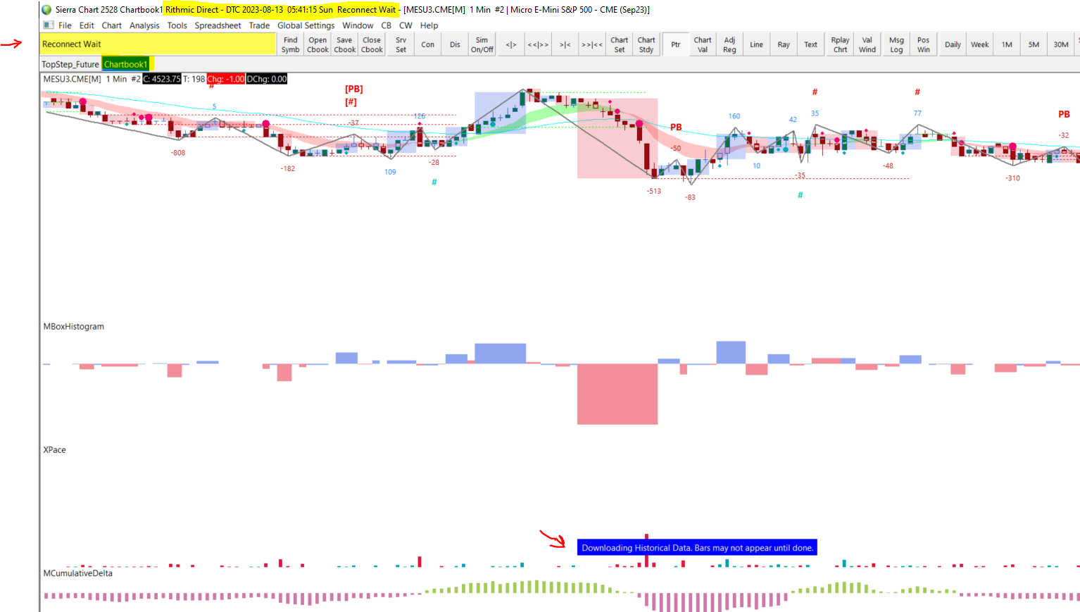 Hi, for some reason today I started to have an issue with SC. as u see in the attached pic, I am getting "Reconnect Wait" however I think its already connected because the data is downloaded. I even opened new chart-book as u see and downloaded new ticker (to avoid having SC reading from already downloaded data) The message log opened by itself and gave the below message (in case it help) Reading Internal Order ID file. | 2023-08-13 05:19:31.468