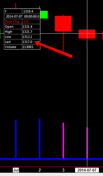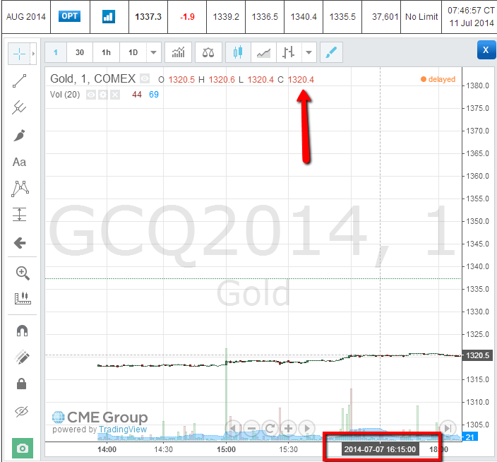 Settlement Price is 1317.0: http://www.cmegroup.com/trading/metals/precious/gold_quotes_settlements_futures.html#tradeDate=07/07/2014 Closing Price is 1320.4: (see attached image) Sierra is showing 1317 (the settlement) as the last price on a daily chart, rather than the actual closing price, is that correct? (another image attached) Thanks, Patrick Z |