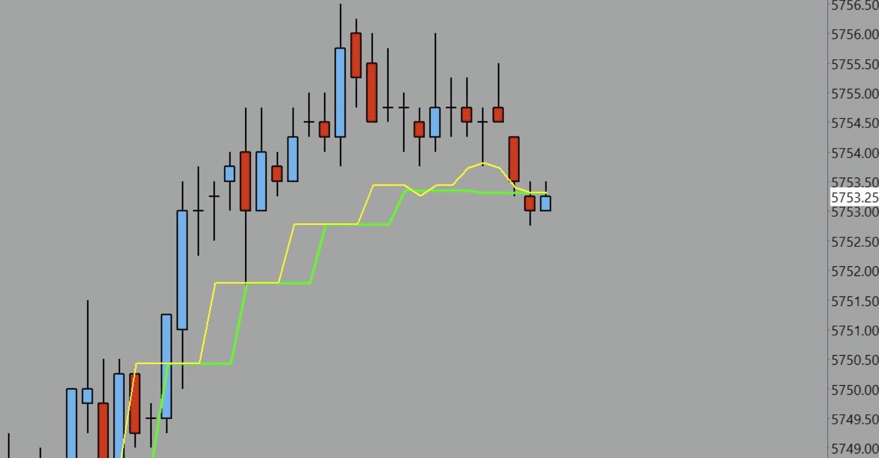 Here's something that updates a higher time frame average based on a lower time frame. This requires overlaying your EMA from the higher time frame onto the lower using Study/Price Overlay. The study then pulls the tick by tick data from the overlay without having to access another chart window. I'm sure someone else has a more elegant solution but this seems to work. You can check for accuracy and tweak. Image is of an ES 1 min with the 5 min overlay (green) and the live update plot (yellow) that will return to stair step when chart is reloaded. Date Time Of Last Edit: 2025-05-12 01:09:34