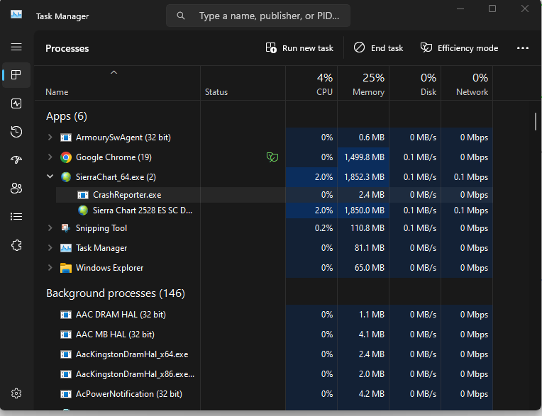The Crash Reporter software is always running, that way if there is a crash it can capture the information to help us determine the issue. Also, we do not see the Sierra Chart software in a "hanging" state in that Task Manager. We see that you are using Delayed data. One of things that can happen when using the Delayed data is that when the system has been disconnected and then connected, it will sometimes download data to the current time (not the current delayed time). Then the bars will not update until the delay time has passed (10 minutes and 10 seconds for the CME Group data). Once the delay time has passed, then the bars will start updating with the standard delay. For the most reliable, advanced, and zero cost futures order routing, use the Teton service: Sierra Chart Teton Futures Order Routing |