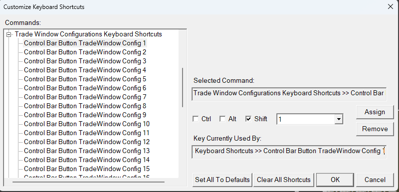 Ah, thank you John. Just so I understand: I have found the 'Trade Window Configurations Keyboard Shortcuts' I can see there are options for up to 32 different 'configs' - are these the saved configurations that are listed in the dropdown menu at the top of the attached trade window? If not, how do I map the keyboard shortcuts to these? Much appreciated, ND |