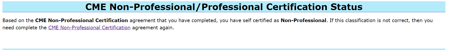 The way your account is setup in relation to the "Professional" v " Non-Professional" for the CME Group, is a bit strange, as you should not be setup as a "Non-Professional" at this point. The reason for this is that you have not completed both of the agreements that are necessary in order to be setup as a "Non-Professional". Please re-complete the "Uniform Subscriber Agreement" at the following link: https://www.sierrachart.com/UserControlPanel.php?page=ExchangeAgreements When you do this, you need to include the name of your FCM/Broker for the Live, Funded, Futures Trading account that you have that will qualify you for the non-professional standing for the CME Group. You also need to include the Account Number for that account. Refer to the following for more information on this: Real-Time Exchange Data Feeds Available From Sierra Chart: Understanding and Accessing Data From the CME, CBOT, NYMEX, COMEX Exchanges For the most reliable, advanced, and zero cost futures order routing, use the Teton service: Sierra Chart Teton Futures Order Routing |