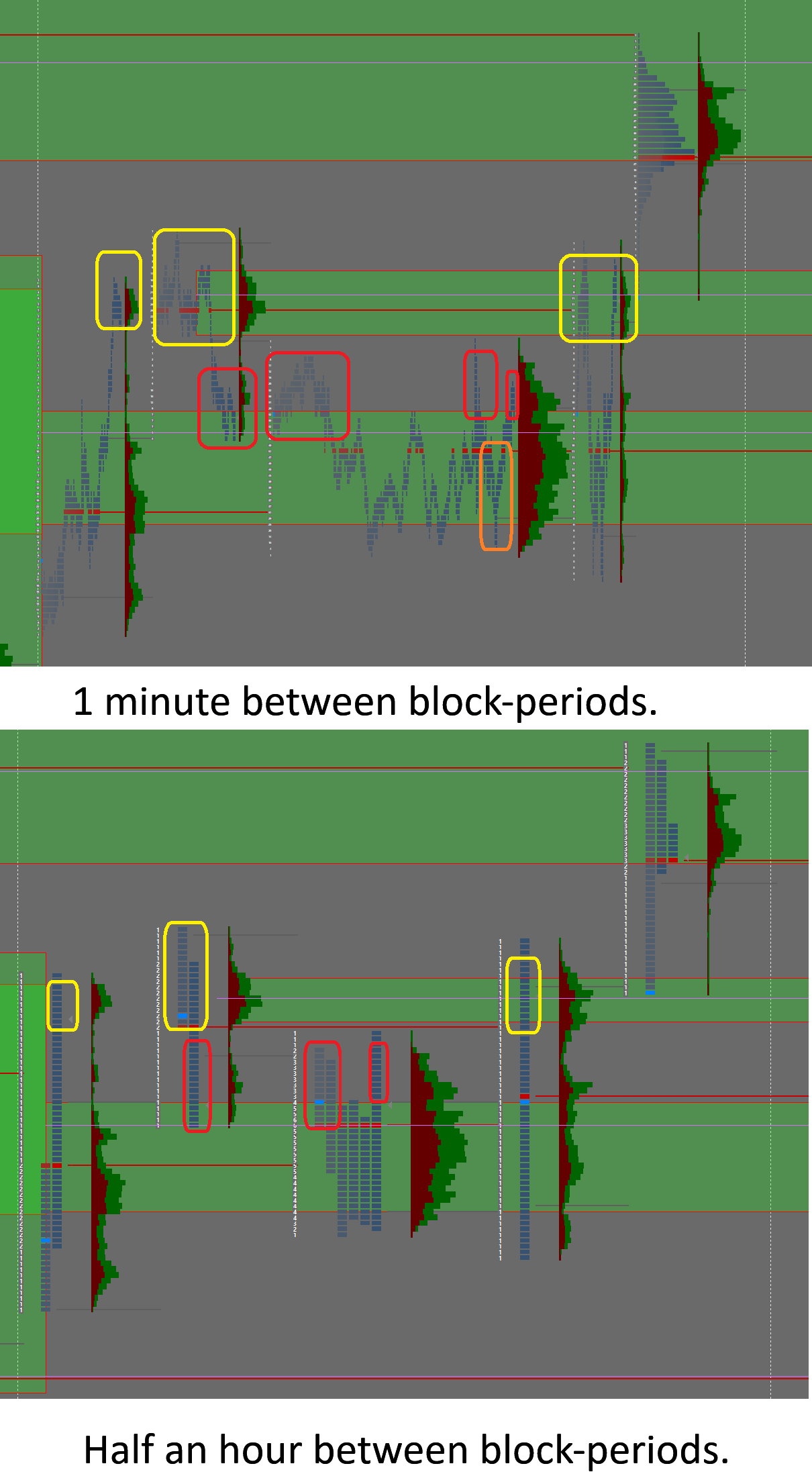 P.S.: There is an even better example of the filling-up outlier-scenario for ESz23 at 2023-11-01T11:30EST. Ok the splitting occurred at the 30-minute-resolution-level, but still we see fillups at larger levels. Plus, the folloowing effect would be the same if we were handling 60 days instead of 2 with 30-minute-periods instead of 1 minute-periods. 1. within the lower image (30 minute-periods) we see balance spread out over two types of splits.: a. the first two yellow markers show a fillup over two days, that might have been avoided by just merging the days (no other blanced block of orders inbetween). b. The third yellow marker does show a fill up of the first two yellow zones, after(!) we had a balanced region (the three red markers) at a lower price inbetween. 2. within the upper image (1 minute-periods) we see that even within the former 30 minute-periods we can have other blanced block of orders inbetween.: a. the third (30 minute-periods) red marker within does comprise actually two red markes (1 minute-periods), b. that are being split up by an intermittent im-balanced region at lower price (orange marker). Date Time Of Last Edit: 2024-01-21 15:09:45