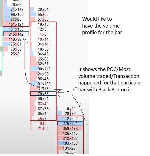As shown in attached pic. 1. What setting should I make to have the volume profile for the bar (Number Bars study) 2. For that particular candle, it shows the POC/Most transaction happened with the black box highlighted. |