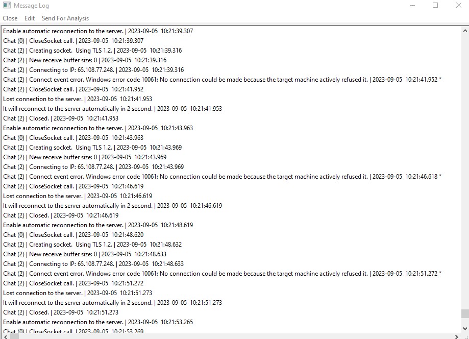 I was curious about the internal Chat Window in Sierra Chart and launched the application. A chat window dialog opens and the SC Message Log opens. The messages in the log show it's persistently trying to connect/re-connect to a server. When I dismiss the message log window by clicking the 'X' the window goes away but then instantly presents itself again and again and again. See attachment for screen shot of the message log. Also pasted portion of message log below Thank you for your assistance. Rick Chat (2) | Connect event error. Windows error code 10061: No connection could be made because the target machine actively refused it. | 2023-09-05 10:23:47.849 * Chat (2) | CloseSocket call. | 2023-09-05 10:23:47.849 Lost connection to the server. | 2023-09-05 10:23:47.850 It will reconnect to the server automatically in 2 second. | 2023-09-05 10:23:47.850 Chat (2) | Closed. | 2023-09-05 10:23:47.850 Enable automatic reconnection to the server. | 2023-09-05 10:23:49.850 Chat (0) | CloseSocket call. | 2023-09-05 10:23:49.850 Chat (2) | Creating socket. Using TLS 1.2. | 2023-09-05 10:23:49.859 Chat (2) | New receive buffer size: 0 | 2023-09-05 10:23:49.859 Chat (2) | Connecting to IP: 65.108.77.248. | 2023-09-05 10:23:49.860 Chat (2) | Connect event error. Windows error code 10061: No connection could be made because the target machine actively refused it. | 2023-09-05 10:23:52.517 * Chat (2) | CloseSocket call. | 2023-09-05 10:23:52.517 Lost connection to the server. | 2023-09-05 10:23:52.518 It will reconnect to the server automatically in 2 second. | 2023-09-05 10:23:52.518 Chat (2) | Closed. | 2023-09-05 10:23:52.518 Enable automatic reconnection to the server. | 2023-09-05 10:23:54.518 Chat (0) | CloseSocket call. | 2023-09-05 10:23:54.518 Chat (2) | Creating socket. Using TLS 1.2. | 2023-09-05 10:23:54.525 Chat (2) | New receive buffer size: 0 | 2023-09-05 10:23:54.525 Chat (2) | Connecting to IP: 65.108.77.248. | 2023-09-05 10:23:54.525 Chat (2) | Connect event error. Windows error code 10061: No connection could be made because the target machine actively refused it. | 2023-09-05 10:23:57.168 * Chat (2) | CloseSocket call. | 2023-09-05 10:23:57.168 Lost connection to the server. | 2023-09-05 10:23:57.168 It will reconnect to the server automatically in 2 second. | 2023-09-05 10:23:57.168 Chat (2) | Closed. | 2023-09-05 10:23:57.168 |