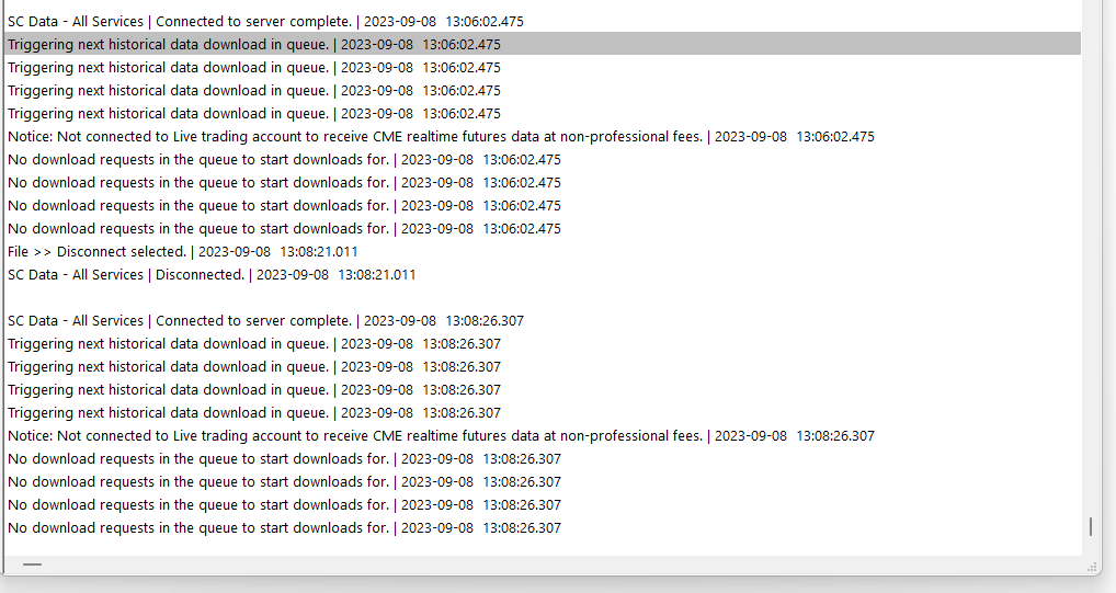 We apologize for the delay. We need to see the entire Message Log as explained in the instructions in post #2 above. We also want you to restart Sierra Chart. Sierra Chart Support - Engineering Level Your definitive source for support. Other responses are from users. Try to keep your questions brief and to the point. Be aware of support policy: https://www.sierrachart.com/index.php?l=PostingInformation.php#GeneralInformation For the most reliable, advanced, and zero cost futures order routing, use the Teton service: Sierra Chart Teton Futures Order Routing Date Time Of Last Edit: 2023-09-08 12:50:52