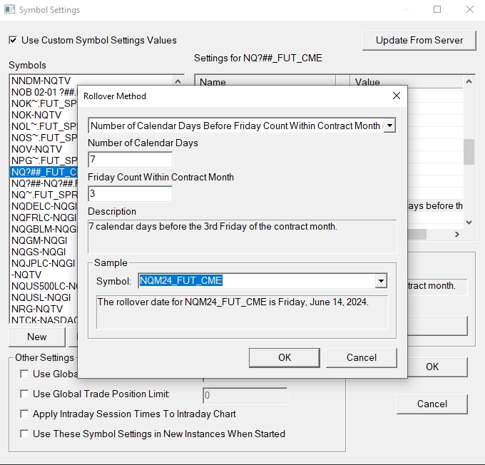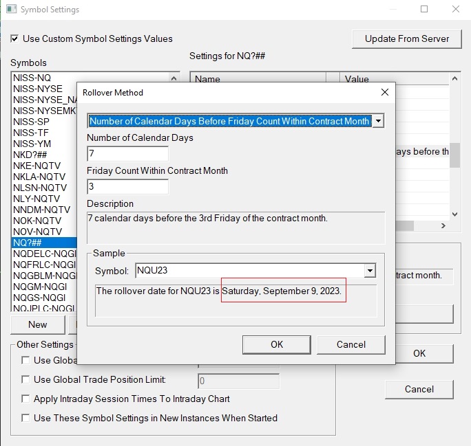 Hi John, thanks! Please see attached. For NQU23, the calculated rollover date is Saturday, September 9th, 2023, which is wrong (7 calendar days before Sept. 15th is Sept. 8th, not the 9th). For NQU24, the calculated rollover date is Friday, September 13th, 2024, which is right (7 calendars days before Sept. 20th is Sept. 13th, is correct). I have also used this setting for three past rollovers, and it never before calculated a Saturday as seven calendar days before a Friday. Given the above, it seems like something has to be wrong with the rollover dates for NQU23, right? Thanks again! Date Time Of Last Edit: 2023-09-11 11:09:51