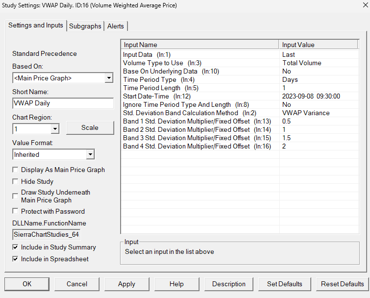 Set Base on Underlying Data to yes in the Sierra Chart VWAP study. Volume Weighted Average Price (VWAP) - Rolling with Standard Deviation Lines: Inputs |