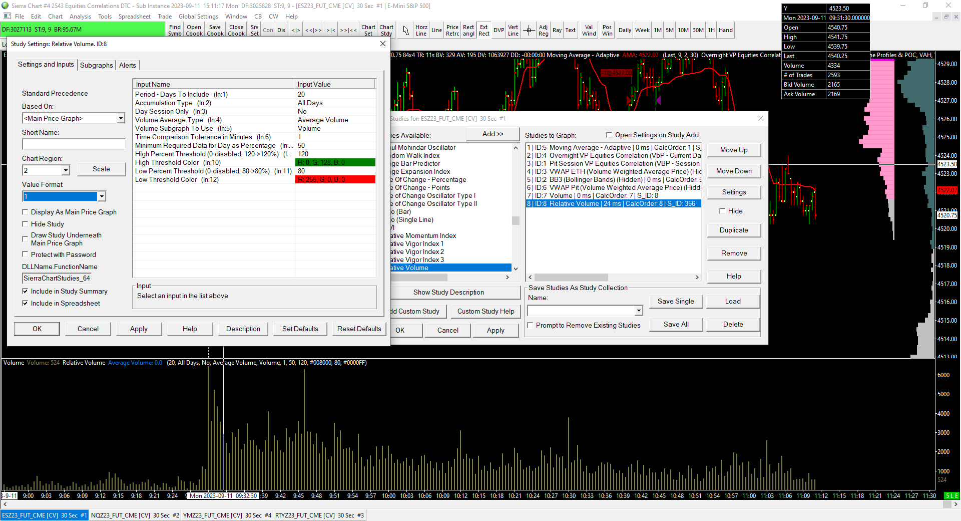 I am having been trouble with the relative volume study in one of of my chartbooks that is in a subinstance What I am trying to do is display an average volume with respect to volume subgraph. The study has been working however for me but this is the second time it does not ? Last ime I just kept changing different variables and was able to get it to display again but not sure what i did. I have other chartbooks in the same subinstance with the same settings and they are displaying the average volume line for me no problem. I have recalculated and reloaded the chart data and deleted and downloaded data. I did rollover the charts today but i did that for other charts where i am not having the problem. Also if i go back to the old contract i still cant get it to display. Is it the fact that I am using a 30 sec chart interval ? Would appreciate your input. Let me know if you need any other information. I believe i have the average line selected to display correctly in the subgraphs section. Thank you |