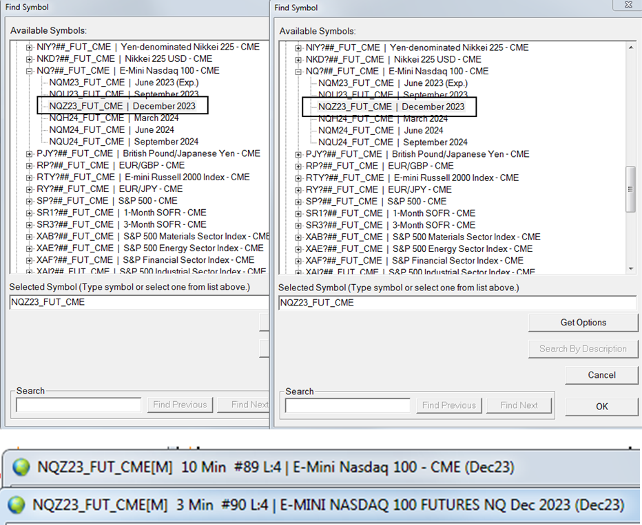 I have two charts of the same contract open, a 10 min and a 3 min but the global crosshair won't show on both. When I looked at the chart headings they are very different, but when I checked the symbols they are exactly the same contract. Why are these showing different headings for the same contract? Everything appears the same as far as charting and price is concerned, so it was only when the crosshair didn't work on both I noted something was amiss. One has capitals and the other upper and lower case. One is Futures and one is just says CME, but it is the same symbol that I am using for both. Price and charting is identical, it's just the crosshair won't appear on both as it seems them as different contracts. I opened a symbol list for each and set them side by side and copied the headings. You can see the grey highlight shows exactly the same contract but the headings are very different. How come? |