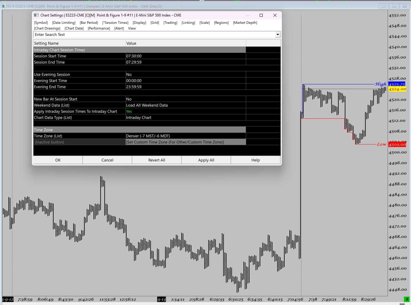 Hi, On the ES chart at ever "Session Start Time" a large bar is displayed with missing data. It doesn't matter what the "Session Start Time" is set to, it has the same issue. I attached to screen image with different "Session Start Time" and you will see it. I Edit/Download Data - Intra Day, and undated SC to current release with no difference. Regards, |