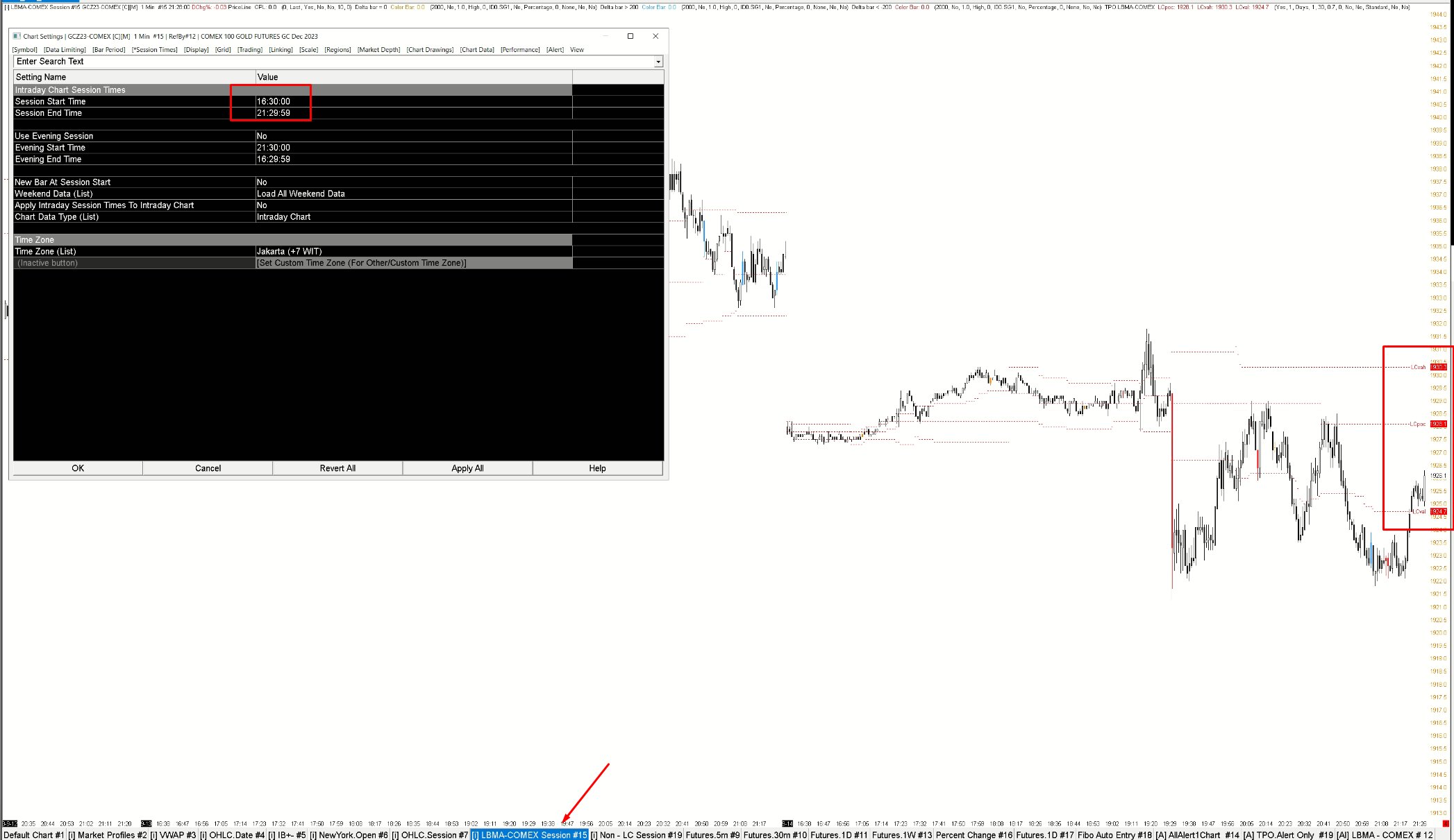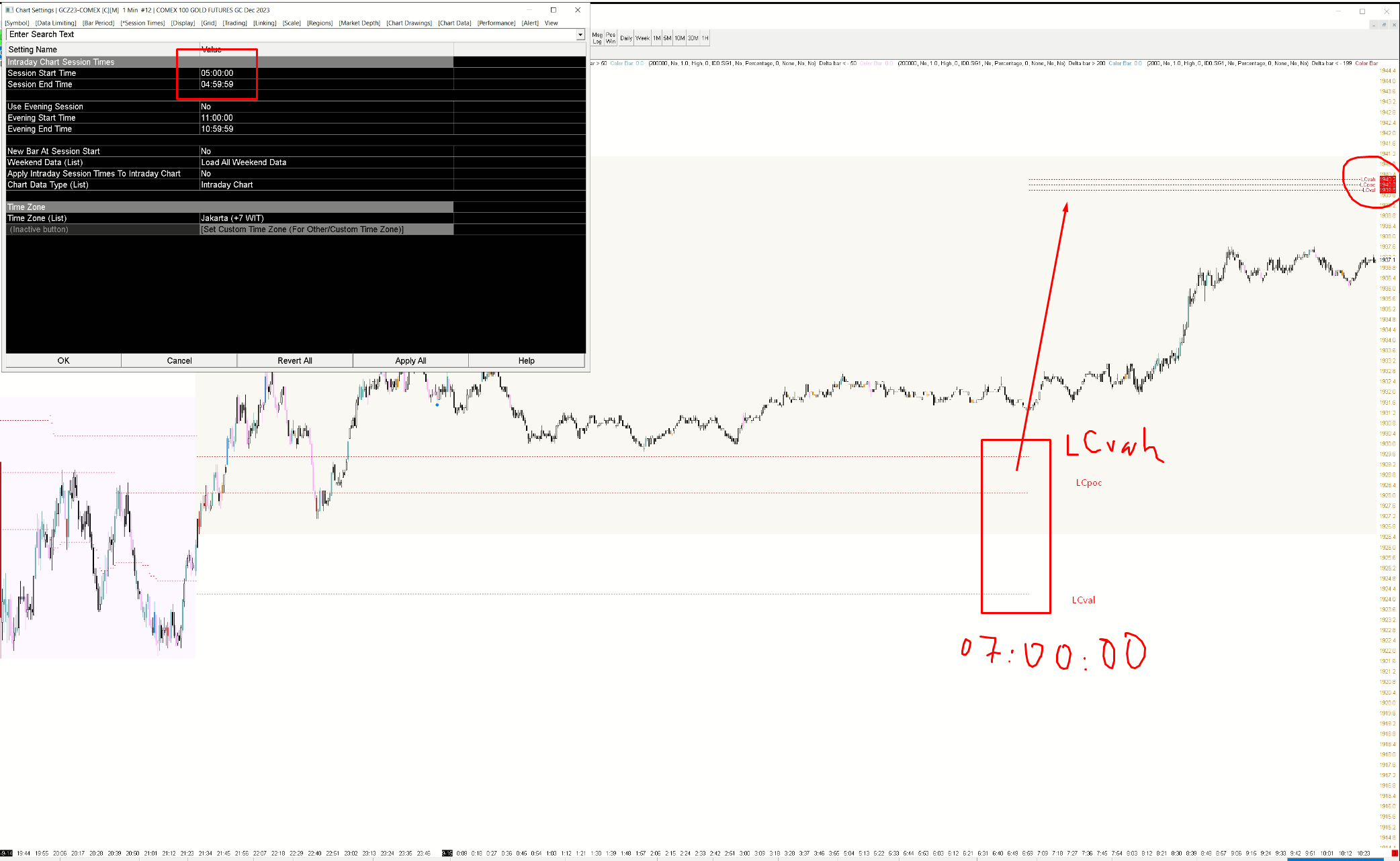 1. I create 1 Chart with Open - Close time: 16:30:00 - 21:29:59 2. I create a TPO Line and have the value LCvah | LCpoc | LCval as shown in figure 1. 3. I use Studies / Price Overlay to take the TPO value just created in 2 to chart 2 with Open - Close: 05:00:00 - 04:59:59 The problem I'm having is that the value of TPO Lines resets automatically at 7:00:00 (in chart number 2). I want the LCvah, LCval, LCpoc values to be pulled until the door opens, which is 16:30:00, what should I do? Am I configuring something wrong? |