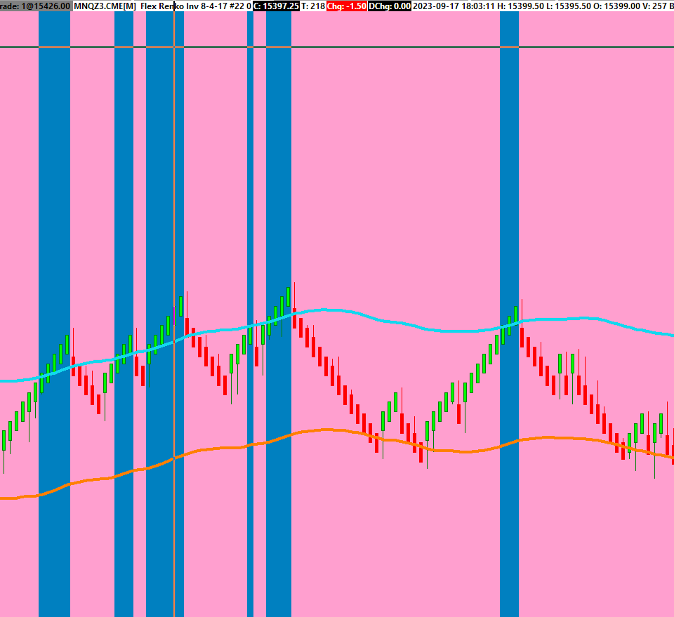 You need to create a persistent TRUE when the Close is > than the upper band, then release it when the Close is < the lower band.Reverse the operators for the opposite color. The TRUE, and the FALSE, are made persistent by referencing the color background's previous bar in the final 'else'. Blue: =IF(C>ID6.SG1,1,IF(C<ID7.SG1,0,ID8.SG1[-1])) where this color background study is ID8. Pink: =IF(C<ID7.SG1,1,IF(C>ID6.SG1,0,ID9.SG1[-1])) where this color background study is ID9. Date Time Of Last Edit: 2023-09-18 00:04:56