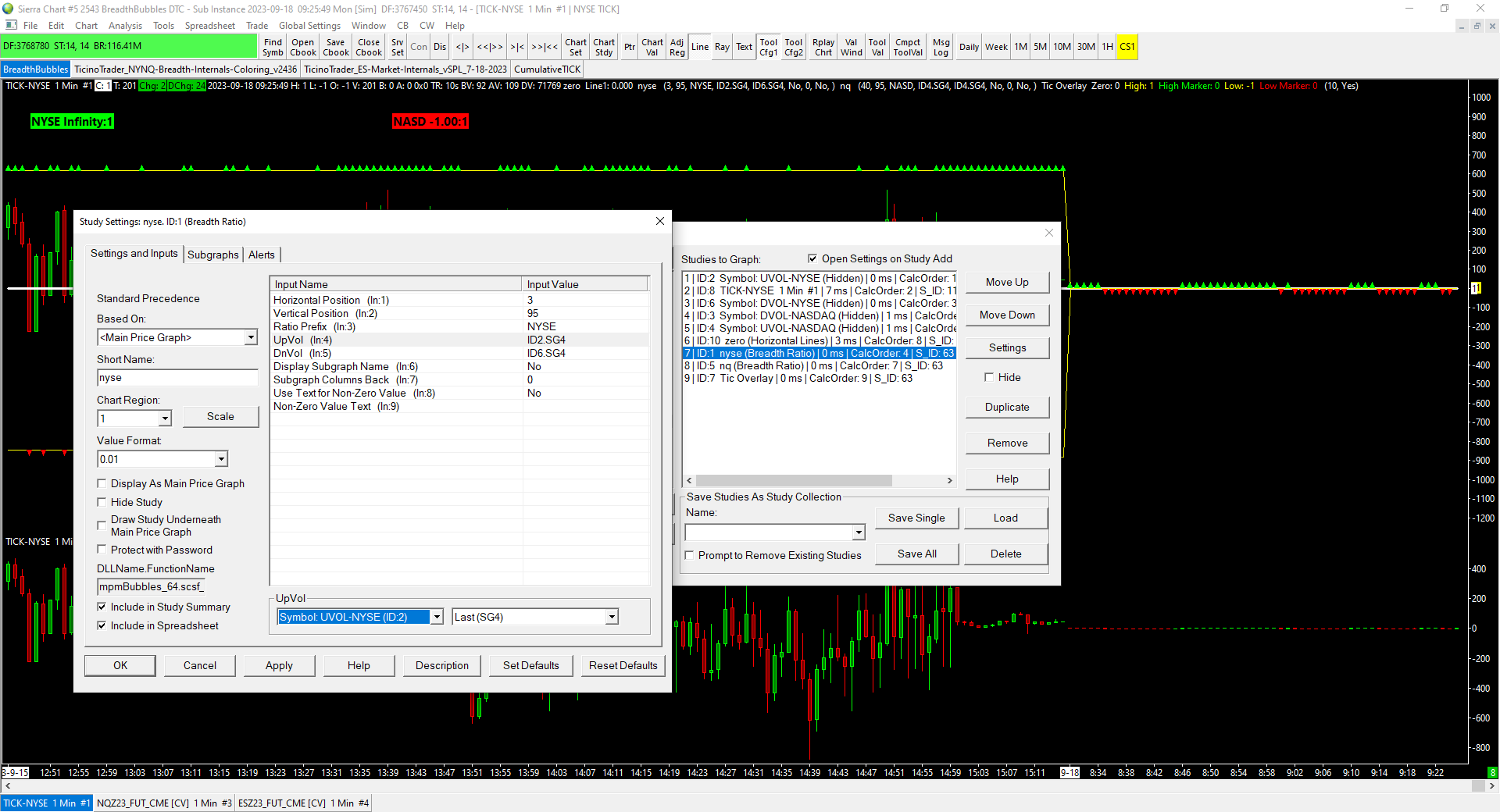 I recompiled a custom study and was able get it functioning I am displaying the market breadth for NYSE and NASDAQ (uvol-dvol) I am not certain why i am not accurately displaying the market breadth for NYSE. It does not calculate for either a positive or negative number. I checked the inputs and they seem ok. Would give me an idea of where the problem may be ? I am attaching two screenshot Let me know if you need other information Thank you SPL |