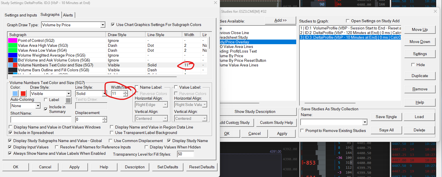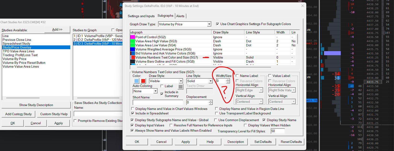 Refer to this Subgraph instead: Volume By Price Study: Volume Numbers Text Color and Size (SG7) Sierra Chart Support - Engineering Level Your definitive source for support. Other responses are from users. Try to keep your questions brief and to the point. Be aware of support policy: https://www.sierrachart.com/index.php?l=PostingInformation.php#GeneralInformation For the most reliable, advanced, and zero cost futures order routing, use the Teton service: Sierra Chart Teton Futures Order Routing |