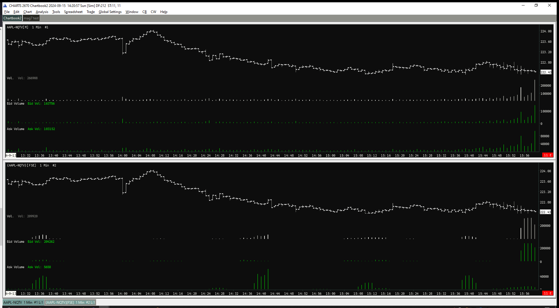 I'm working to have a chart with 1 second data via Custom Calculated Symbols. I have various symbols all aimed at having a chart of the ES: .5*{ESZ23-CME} +.5*{ESZ23-CME}, {ESZ23-CME}/2+{ESZ23-CME}/2, 1*{ESZ23-CME}, {ESZ23-CME}, 6*{ESZ23-CME}-5*{ESZ23-CME}, all of which chart Region 1 fine with 30 second bars. The problem is that all of them show different values for the Volume study and none match the volume of a normal chart of the ES. That makes use of any volume based bars or studies moot. If any symbol was to be correct I would expect that it would be {ESZ23-CME} but volume is way different than the usual ES chart with exact same settings. If I pull up a new chart with one of the custom symbols it does not initially display [FSE] but when I add the volume study [FSE] displays and after removing the volume study the chart still displays [FSE]. The docs seem to indicate that custom symbol volume should be useful but I can't see how at this point. |