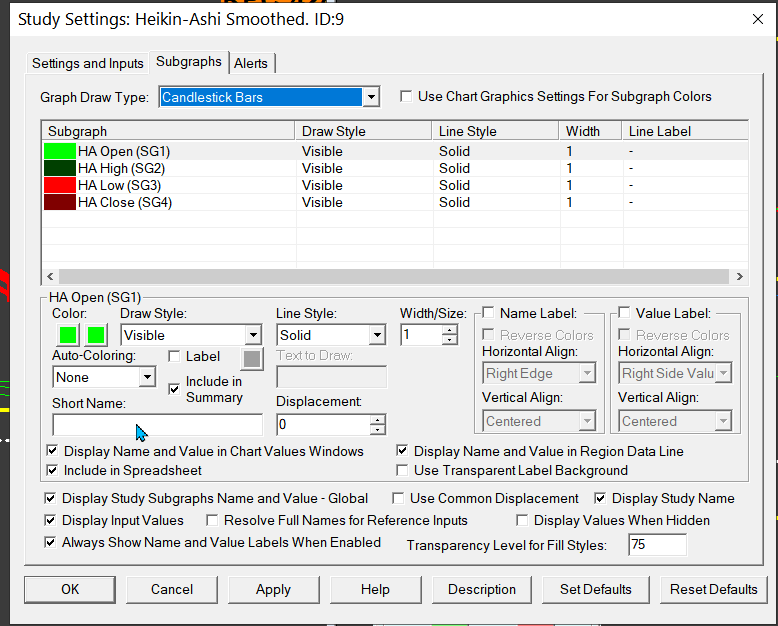 To change the colors of part of the candlestick for a Heikin-Ashi study, you need to change the Subgraphs for the Heikin-Ashi study itself. In this particular case, you want to change the Primary color for the "Low" subgraph. This will change the wicks and the outline for the candle. You can also change the "Size/Width" to adjust the width of the outline. The width of the wicks is controlled by the "Last" width setting (but not the color). Refer to the following: Chart Studies: Subgraphs Tab >> Color For the most reliable, advanced, and zero cost futures order routing, use the Teton service: Sierra Chart Teton Futures Order Routing |
