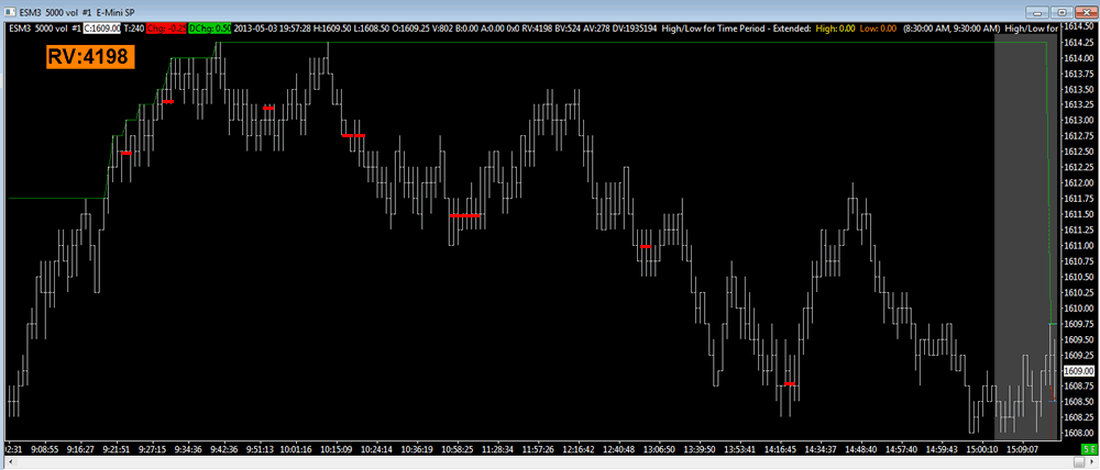 Is there any reason not to use tick by tick data for everything besides slower loading times? It's now showing a lot of empty bars and some which have the specified volume (see screenshot). Can this data be imported to another chart? I'd like to have something that looks like the photoshopped image where the red bars represent trades over a certain volume. |
