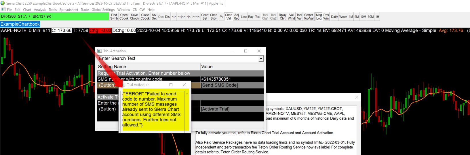 Hi, I recently created an account with Sierra chart but i am unable to activate my trail account. When i enter my mobile number and click 'send sms code' then i get an error message. Please see the error message in the screenshot attached. I wish to activate the trial account asap as I have been trading futures for a while but need to practise on Sierra chart. Your prompt reply will be appreciated. Many thanks Sabrine |