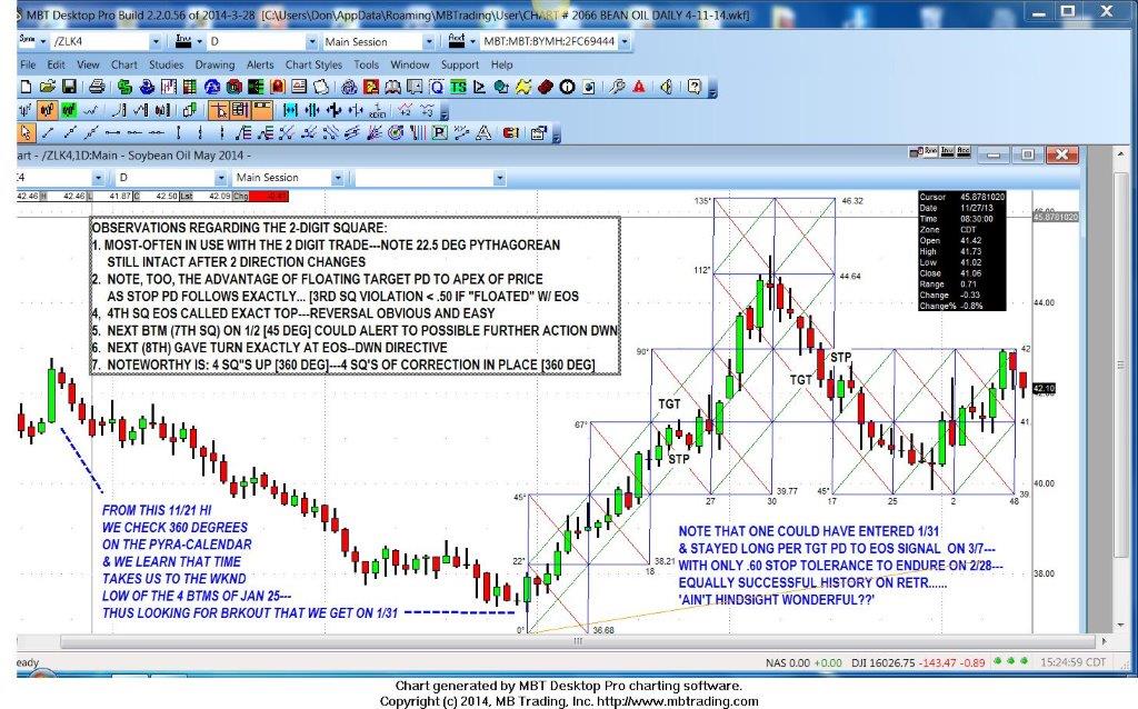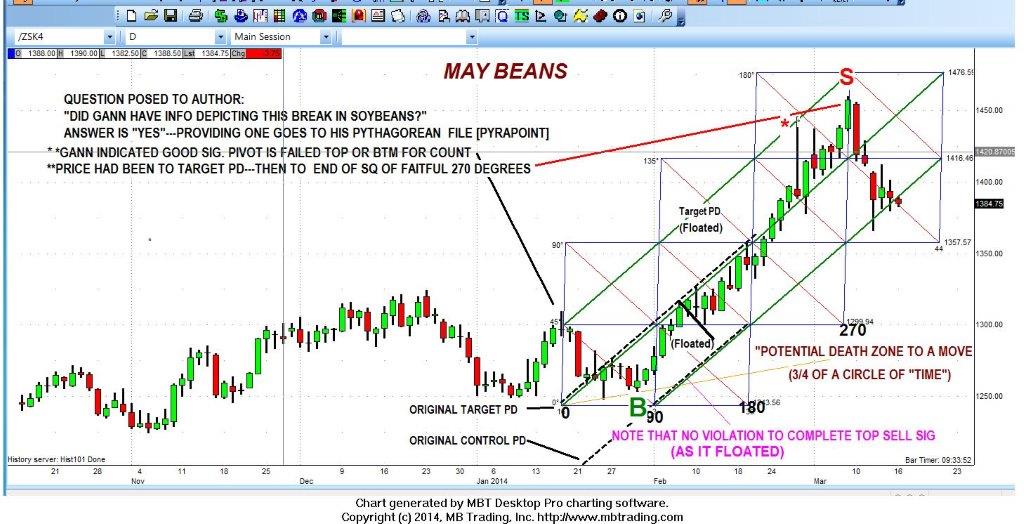 I have "played with" the SC Gann Tool and it has many limitations which hinder its use in substituting for the Pyrapoint tool which is implemented on Ensign, Ensign10, MB/Realtick, Tradestation, Ninja, eSignal and Metastock. Here are some words by Don Hall creator of Pyrapoint: By way of introduction, I am Don Hall, and my reason for formulating Pyrapoint is to accurately track, and indeed project, movement of markets as reflected across the Pythagorean Cube. The ancestry of Pyrapoint would date back to 1956, when I began hedging in a Commercial Grain Elevator that I owned. I became an ardent student of W.D. Gann, seeking to unravel the very accurate market cycles that were credited to him. By further introduction, I have been a principal in a Commodity Trading firm, Alpha Systems, have held a seat on the CBOT while an acting Principal in a commodity trading firm, and have carried a CTA license---all past history. Of special interest to me has been the tracking of W.D. Gann's famously supervised trip to the "trading pit" in Chicago, where he was recorded as making some 87% profitable trades on nearly 200 trades. It became especially important to me when I learned, first hand, from Gann’s next-desk trading associate, Rhinalto Alghini, that the only tool that Gann took to the pit for the test was a miniature "Square of Nine". Gann called this his "Master Calculator". "Reno" became a personal friend as well, as we were both members of ACE (Astro-Cycle Exchange) a group of 50 designated for advanced cycle studies in Chicago. Although I find no record of Gann's acknowledgment of it, in reality the "Square of Nine" is a Pythagorean Cube (P.C.), A SQUARE ROOT CALCULATOR. I am told (again first-hand) by my mentor in Cairo, Fuad El Zahaby (while I was studying in Egypt in the Mid-seventies) that it was an early Egyptian Calendar, a basic mathematical tool, and very instrumental in the construction of the Great Pyramid. I had long known the "mystic" action of price between the significant diagonals located upon the face of the Pythagorean Cube. This was especially true for support and resistance as used by Gann in very expensive seminars where he was teaching the significance of the 45 degree angle, as well as the multiples and divisions per his analogy as applied to the square root calculator. We feel that it is especially significant that Gann called 90 degrees his "Pattern Chart". One quick note of support: when one becomes convinced of the validity of the square root influence in market moves, one will realize the value of the square of nine (Pythagorean Cube) in the pit with W.D....MARKETS MOVE IN SQUARE ROOT INCREMENTS! To get a quick idea as to how Gann knew how to use the square root calculator, take ANY number on the P.C., advance 90 degrees on the face of the "Cube", count the digits to that point, and you will have the square root of your beginning number. Every number on the P.C. designates an angle for this calculation. Without further belaboring the point, one can see how Pythagoras and the Hypotenuse Rule opened the door for Pyrapoint: on a right angle axis, where price is the vertical angle and time is the horizontal angle, the relationship of Price and Time's "squaring" is always expressed on the hypotenuse---and always 90 degrees. THUS: BIRTH OF THE PYTHAGOREAN DIAGONAL (P.D.), a most mystic trend line (AND CHANNEL!) Our prejudice is reflected in our expressed assumption that the "only trend lines that carry a high accuracy history are those that coincide with the Pythagorean CALCULATED trend lines---i.e. THE PYTHAGOREAN DIAGONALS". This is the plight of Pyrapoint: The Code counts time, plots price, and gives objectives for each---all calculated (and oh, yes, with targets supporting VERY close stops). I personally feel that it is the only way that I can afford to enter today's markets. Thus: WE ARE CHANNEL TRADERS, YIELDING US CALCULATED TARGETS, EXACT STOPS, AND EXACTLY-DEFINED PRICE HIGHWAYS TO INDICATE EXACT TREND CHANGES. A support library of some 1000+ charts has been developed to prove our commitment to the Pythagorean Diagonal Concept, (the PD’s). Attached is an illustration of Pyrapoint in Ensign. Here are some links to understanding Pyrapoint time/price relationship: http://ensign.editme.com/t13trend and here is a link a correct implementation of Pyrapoint in Ensign: http://ensign.editme.com/pyrapoint and here is a link to how square root theory helps forecast price: http://ensign.editme.com/t14square Don will share his Pyrapoint concept with Sierra Chart freely if you contact him and let him be a user of Sierra Chart for verification of correct implementation and use: pyrapoint1@earthlink.net |
