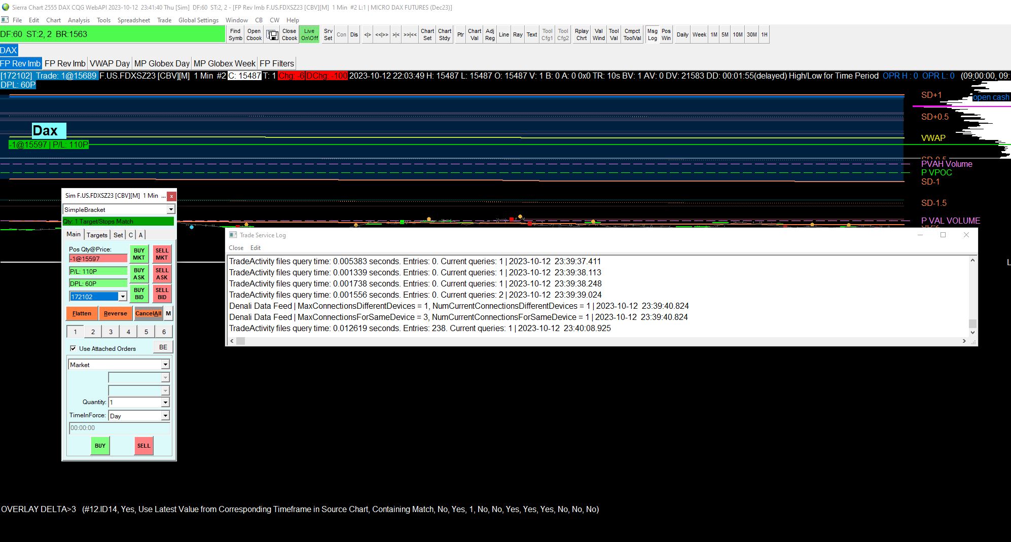 Delete the fills that are not correct, if any. Select them individually and use the Delete Trade Activity Entry command: Trade Activity Log: Trade Activity Data Editing Menu Commands (Trade >> Trade Activity Log) so, here, i tested to open a new trade (buy at 15264) in live. It "closed" the short from yesterday (at the price of the opening) it count in DPL = +333 i closed the buy at 15266, so my balance get the profit, but now, i have this "trade" that is not in live (but in sim), and will be always count in DPL until i do a next trade... Help With Daily Profit/Loss Value: Simplified Steps to Solve Incorrect Daily Profit/Loss Sierra Chart Support - Engineering Level Your definitive source for support. Other responses are from users. Try to keep your questions brief and to the point. Be aware of support policy: https://www.sierrachart.com/index.php?l=PostingInformation.php#GeneralInformation For the most reliable, advanced, and zero cost futures order routing, use the Teton service: Sierra Chart Teton Futures Order Routing |
