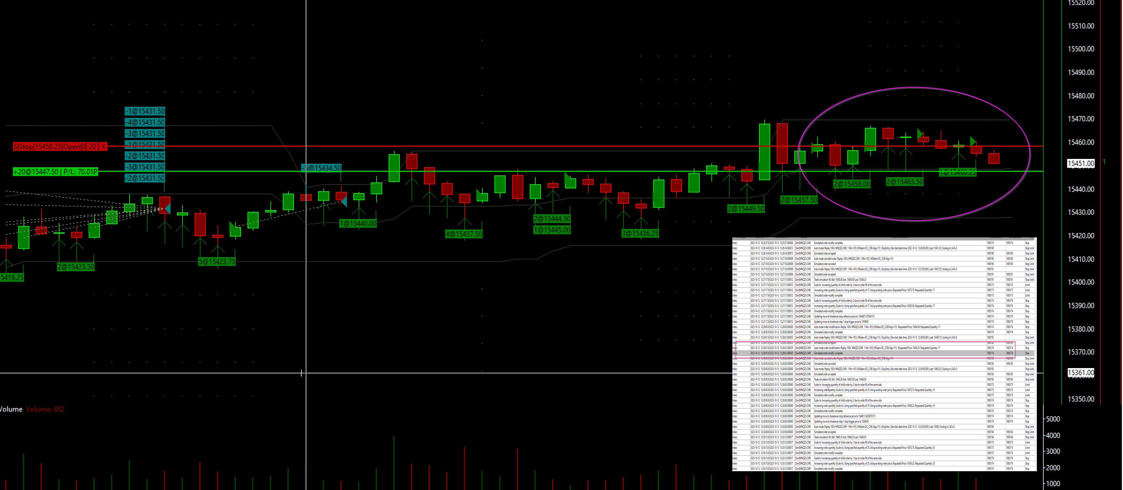 Hi Support, I am simulating using my ACSIL trading system. I enable Scale-In and I have modifications of attached stop orders. The scaled-in stop order is modified and completed as per the trading activity log. The issue is the trade simulation is not processing the stop order. For example, In a long position and price goes below the stop, the stop is not executed. It just keeps being modified which means its still recognized by ACSIL as working stop order but not executed at all.. This behavior is occasional as for some cases during simulation, the stop order changes and executes when price goes below it in long or above it in short and some other cases during same simulation it is not honored as in attached example, though the order modify is complete. Take into account If Scale-In is not enabled, this issue will vanish and modified stop orders are executed when price goes below it. Kindly refer to the attached figure, where price is shown below the stop and the stop order is not executed. Is this an expected behavior ? Thanks a lot for your kind feedback ... |