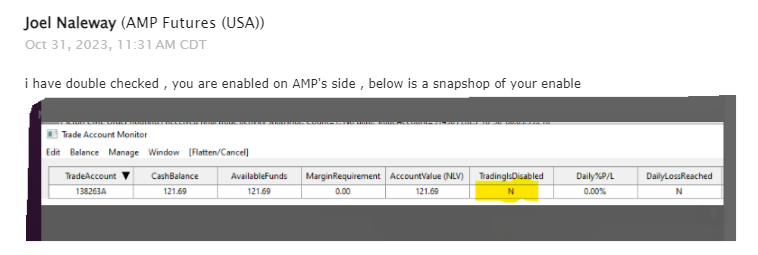 Hi, I use AMP main account 138263 CQG for Jigsaw, price ladder, and then the sub account 138263A Teton for Sierra. I've just tried to put on a position via Sierra chart and it failed? Any idea why? |