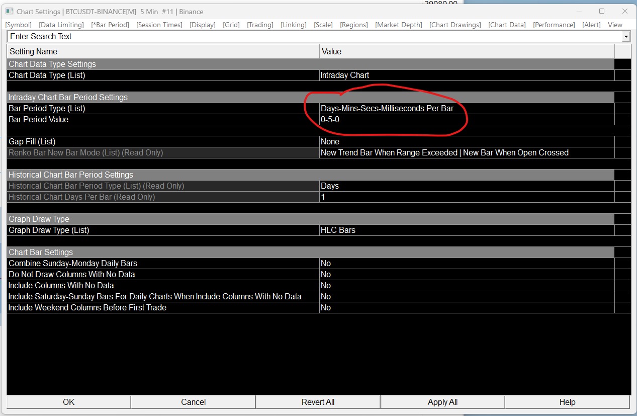 one more question oh wise ones... please see the attached screen shot. what values should be in these to columns please? comparing it to my ES chart, which reads 'volume per bar' and '5000' respectively, it seems the set values for my bitcoin chart are too detailed. i'm presuming that's why my computer slows down?? anyhow, when i attempted to change the values in the bitcoin chart to 'volume per bar' and '5000', the chart starts to load up but stops at 99.23% every time. i end up having to abort. i've also attached the values in the <symbols> part of the chart settings if you don't mind checking the values i've inputed there too? Date Time Of Last Edit: 2023-10-19 10:17:09