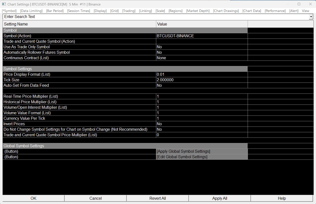 For the Tick Size use: 2 You have it set too high. This is the setting we are referring to: Chart Settings: Tick Size (Chart >> Chart Settings >> Symbol >> Symbol Settings menu) Sierra Chart Support - Engineering Level Your definitive source for support. Other responses are from users. Try to keep your questions brief and to the point. Be aware of support policy: https://www.sierrachart.com/index.php?l=PostingInformation.php#GeneralInformation For the most reliable, advanced, and zero cost futures order routing, use the Teton service: Sierra Chart Teton Futures Order Routing |