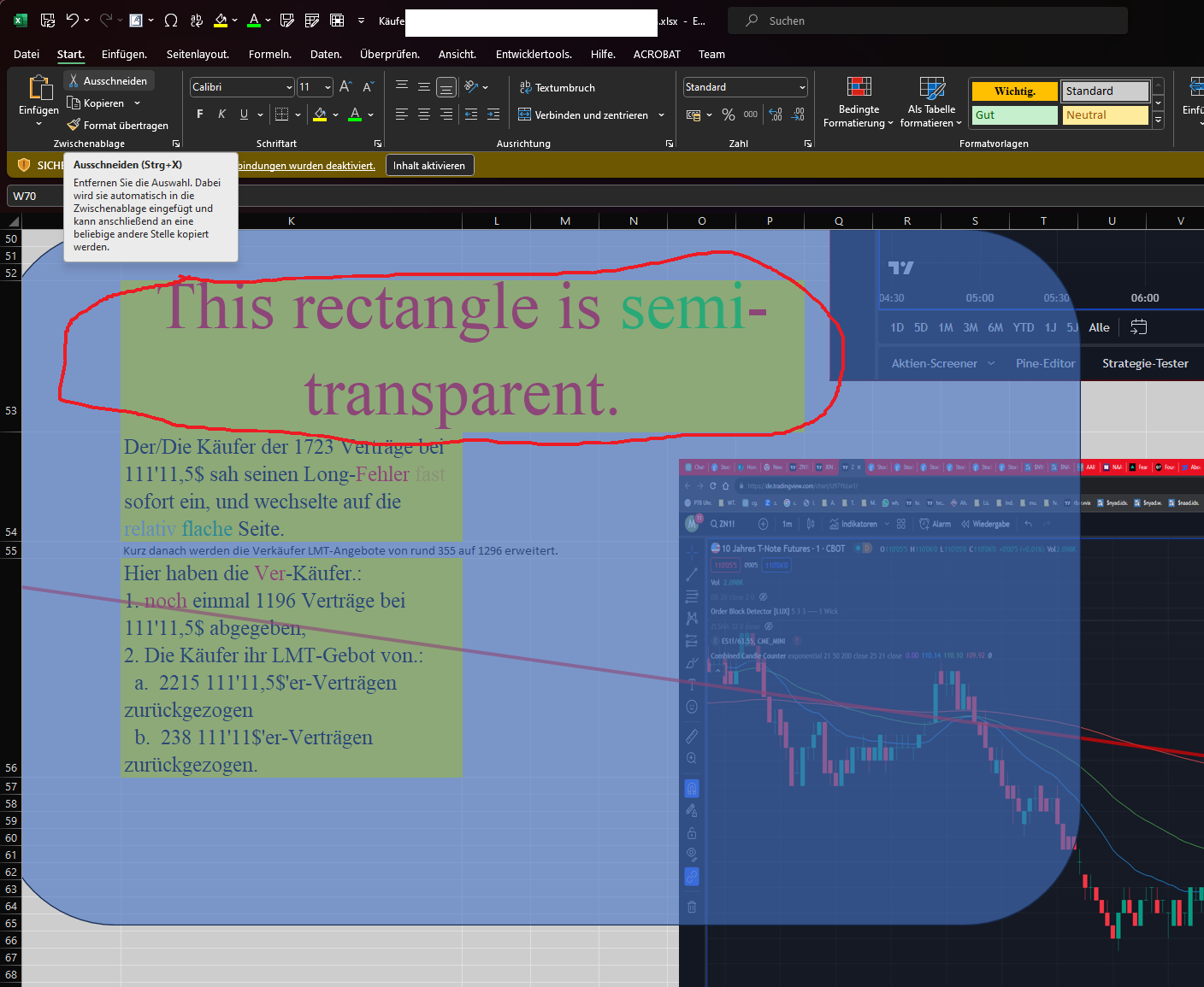 Moin Moin. In Excel (on Windows 10/11) You can use semi-transparent rectangles. (Please see "In Excel You can use semi-transparent rectangles....png" ). _Tschüß, __Michael. |