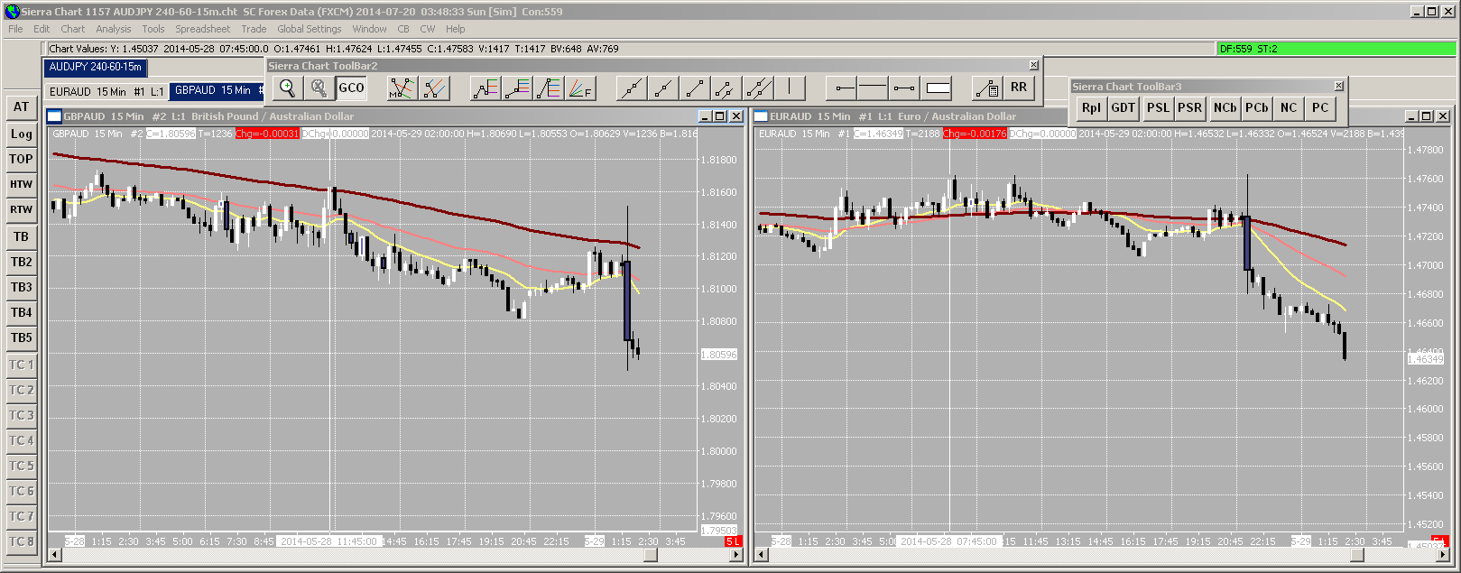 I have scrolled all charts to the end. The global cursor shows different times on the GBPAUD and EURAUD charts. Find a number of screenshots attached. Thanks.