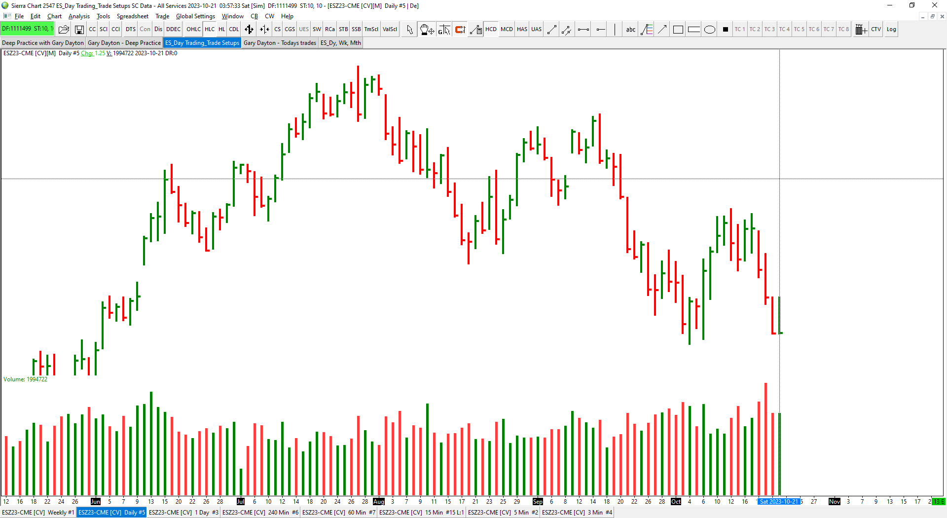 The Daily chart is showing an additional bar at the end of the chart which appears to be some sort of copy of todays bar. In the attached image, todays bar (Fri Oct 21) is shown (second last bar) and a 'Saturday' bar is also displayed with similar OHLCV (see X-axis label). However it appears the Saturday bar is being updated live but Friday bar is static. The time of the chart was around 15:55 NY time. I have updated the chart using 'Download data to end of chart' and reloaded the chart data with no change. |