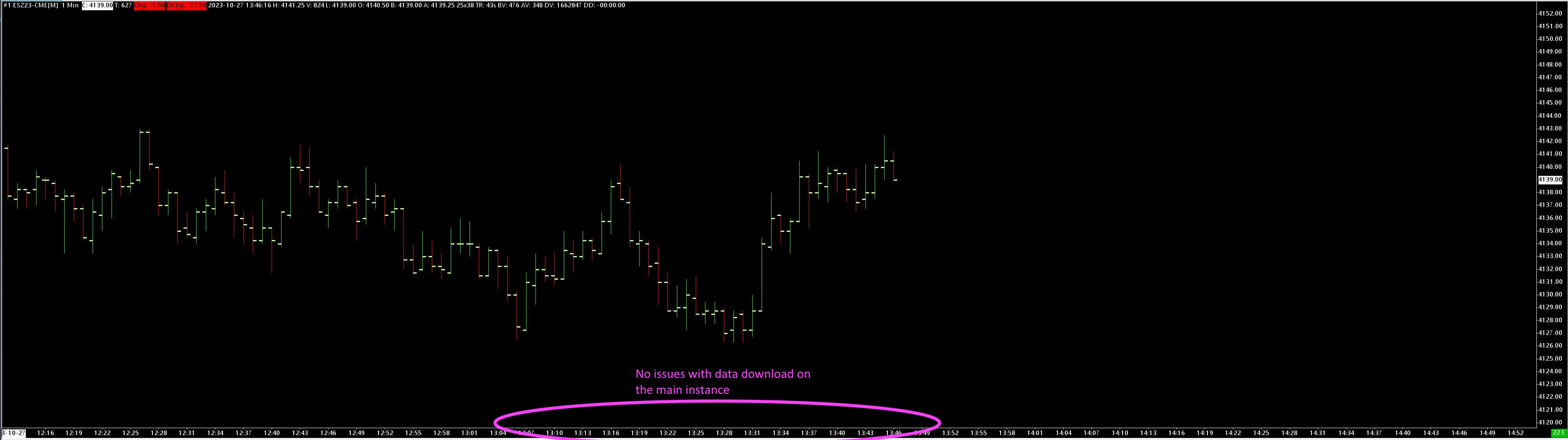 Hello, i have created two new chart-books one in main instance and another in sub-instance. Both of these chart-books have same symbol which is ESZ23-CME. downloaded the data when i opened these charts in these two chart-books. Saved and closed both these chart-books (in main instance and sub instance) Then closed the Sierra chart completely and turned-off the PC. After 15mins logged back into both Main instance and sub-instance opened both chart-books in respective instances. The chart in main-instance downloads the data that was missing for 15mins. but the chart in sub-instance DOES NOT download the data that was missing for 15mins. Please see the screenshots attached. This issue is making sub-instances un-usable at all. FYI: I'm using SC in SIM mode and selected "SC Data- All services" and i have tried the following on the sub-instance: - Tried disconnecting and reconnecting to the data and no use. - Tried doing "Edit>> Edit/download Data - intraday chart" and this makes the chart even worse. Please see the screenshots attached |
