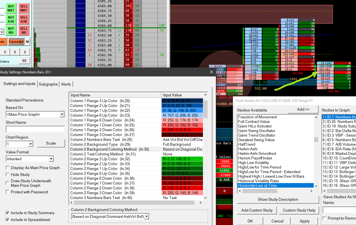 So how do I get the coloring to match the text? The text is set to Ask Vol Bid Vol Diff Diagonal 1 Side, But there's no option for the coloring with that setting...