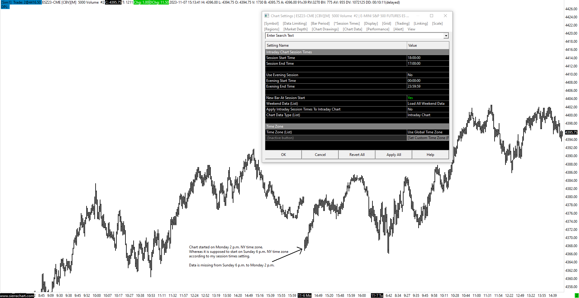 If there is missing data, refer to: Historical Intraday Data (Missing Data / Download Errors / Viewing More Data): Retrying the Download When There is Data in the Chart Sierra Chart Support - Engineering Level Your definitive source for support. Other responses are from users. Try to keep your questions brief and to the point. Be aware of support policy: https://www.sierrachart.com/index.php?l=PostingInformation.php#GeneralInformation For the most reliable, advanced, and zero cost futures order routing, use the Teton service: Sierra Chart Teton Futures Order Routing |