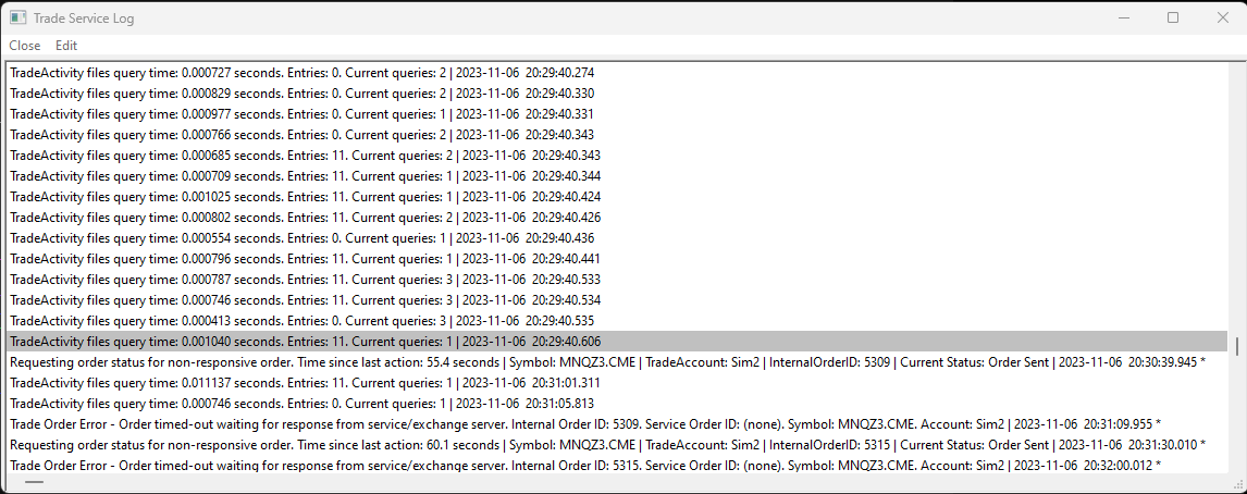 When I attempt to place an order, I see the order on the DOM; however, it does not get placed through to the chart. I then get a message on my trade service log saying the order timed out. I am attaching a copy of the service log for you to review. Any assistance is much appreciated!