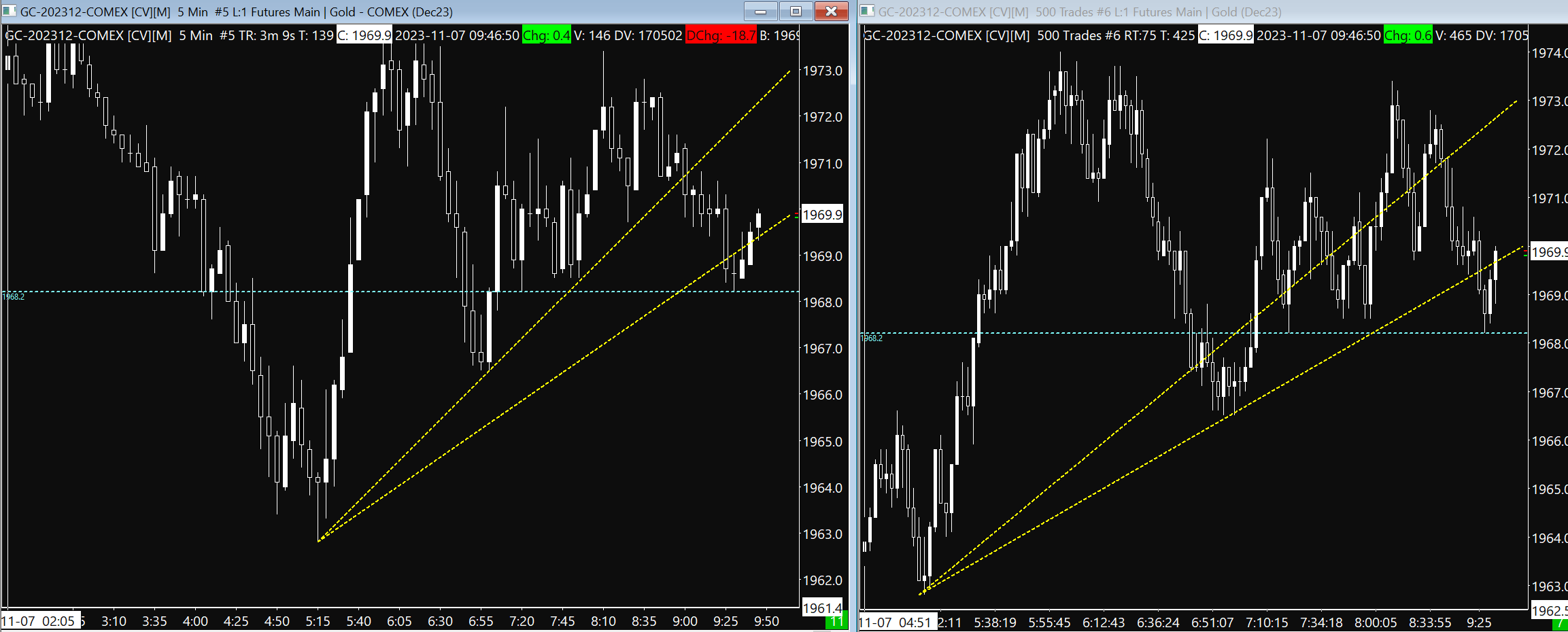 I have this problem where when i dray a trend line on a minute chart it does not line up on the "trade" Tic chart. I have included an image. they are the same tickers and both volume based rollover. Not sure how to fix this. thanks |