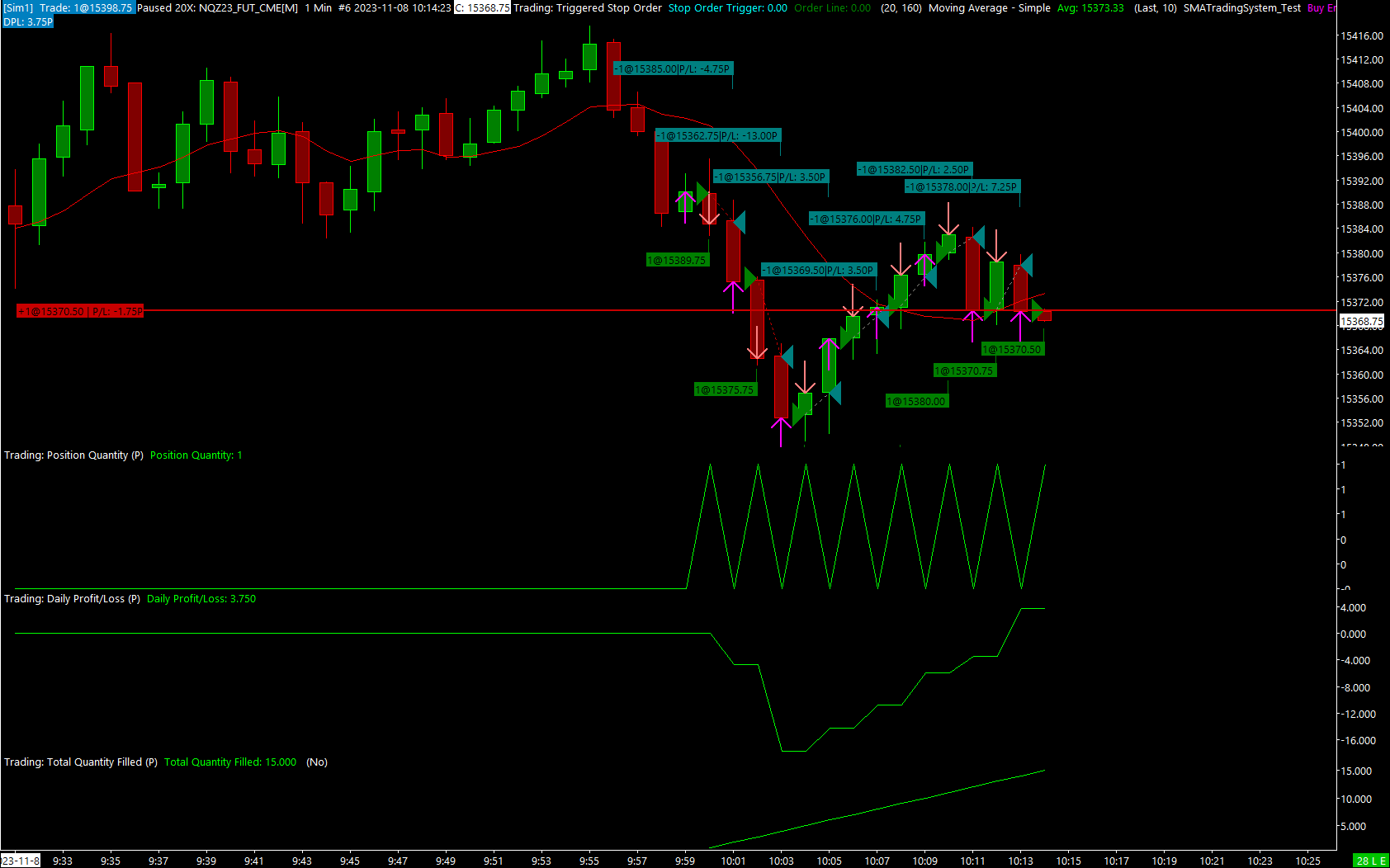 I wrote a simple C++ code (I copied almost all the code from TradingSystem.cpp in C:\SierraChart\ACS_Source folder). It uses Simply Moving Average with length 10 applied on 1 min chart for NQZ23 (futures). It should enter a Buy order when last closed Close price crosses up SMA, and enter a Sell order when last closed Close price crosses down SMA. However the C++ code does function properly. Please see the attached screenshot https://www.sierrachart.com/image.php?Image=1699469383754.png which shows that multiple Buy orders were entered when last closed Close prices were far below SAM, and multiple Sell orders were entered when last closed Close price were above SAM. Buy orders should only be entered when last closed Close price crosses up SMA, and Sell orders should only be entered when last closed Close price crosses down SMA. (https://www.sierrachart.com/image.php?Image=1699469383754.png) I first found the issue when I tried to use system study "Trading System Based on Alert Condition", and submitted a ticket around 2 months ago, but I got no answer to this issue. So I looked the C++ codes in TradingSystem.cpp, and created the code "!!SMATradingSystem_Test.cpp" based on TradingSystem.cpp (the code is attached too along with the screenshot). Please let me know what caused the Buy and Sell orders wrongly entered. Thank you very much for your help! Below is my C++ code: /////////////////////////// #include "sierrachart.h" SCDLLName("SMATradingSystem_Test") /*==========================================================================*/ SCSFExport scsf_TradingExample(SCStudyInterfaceRef sc) { SCInputRef Input_Enabled = sc.Input[0]; SCInputRef Input_NumBarsToCalculate = sc.Input[1]; SCInputRef Input_DrawStyleOffsetType = sc.Input[2]; SCInputRef Input_PercentageOrTicksOffset = sc.Input[3]; //SCInputRef Input_OrderActionOnAlert = sc.Input[4]; SCInputRef Input_EvaluateOnBarCloseOnly = sc.Input[5]; //SCInputRef Input_SendTradeOrdersToTradeService = sc.Input[6]; SCInputRef Input_MaximumPositionAllowed = sc.Input[7]; SCInputRef Input_MaximumLongTradesPerDay = sc.Input[8]; SCInputRef Input_MaximumShortTradesPerDay = sc.Input[9]; SCInputRef Input_EnableDebuggingOutput = sc.Input[10]; SCInputRef Input_CancelAllWorkingOrdersOnExit = sc.Input[11]; SCInputRef Input_AllowTradingOnlyDuringTimeRange = sc.Input[12]; SCInputRef Input_StartTimeForAllowedTimeRange = sc.Input[13]; SCInputRef Input_EndTimeForAllowedTimeRange = sc.Input[14]; SCInputRef Input_AllowOnlyOneTradePerBar = sc.Input[15]; SCInputRef Input_Version = sc.Input[16]; SCInputRef Input_SupportReversals = sc.Input[17]; SCInputRef Input_AllowMultipleEntriesInSameDirection = sc.Input[18]; SCInputRef Input_AllowEntryWithWorkingOrders = sc.Input[19]; SCInputRef Input_ControlBarButtonNumberForEnableDisable = sc.Input[20]; SCInputRef Input_CancelAllOrdersOnEntries = sc.Input[21]; SCInputRef Input_CancelAllOrdersOnReversals = sc.Input[22]; SCInputRef Input_SendOrdersToTradeService = sc.Input[23]; SCInputRef Input_CancelAllOrdersOnEntriesAndReversals = sc.Input[24]; //Define references to the Subgraphs and Inputs for easy reference SCSubgraphRef Subgraph_BuyEntry = sc.Subgraph[0]; SCSubgraphRef Subgraph_BuyExit = sc.Subgraph[1]; SCSubgraphRef Subgraph_SellEntry = sc.Subgraph[2]; SCSubgraphRef Subgraph_SellExit = sc.Subgraph[3]; SCSubgraphRef Subgraph_SimpMovAvg = sc.Subgraph[4]; //SCInputRef Input_Enabled = sc.Input[0]; //SCInputRef Input_TargetValue = sc.Input[1]; //SCInputRef Input_StopValue = sc.Input[2]; if (sc.SetDefaults) { // Set the study configuration and defaults. //sc.GraphName = "Trading Example: Using Moving Average and Target and Stop"; sc.GraphName = "SMATradingSystem_Test"; Subgraph_BuyEntry.Name = "Buy Entry"; Subgraph_BuyEntry.DrawStyle = DRAWSTYLE_ARROW_UP; //Subgraph_BuyEntry.PrimaryColor = RGB(0, 255, 0); Subgraph_BuyEntry.PrimaryColor = RGB(255, 0, 255); Subgraph_BuyEntry.LineWidth = 2; Subgraph_BuyEntry.DrawZeros = false; Subgraph_BuyExit.Name = "Buy Exit"; Subgraph_BuyExit.DrawStyle = DRAWSTYLE_ARROW_DOWN; Subgraph_BuyExit.PrimaryColor = RGB(255, 128, 128); Subgraph_BuyExit.LineWidth = 2; Subgraph_BuyExit.DrawZeros = false; Subgraph_SellEntry.Name = "Sell Entry"; Subgraph_SellEntry.DrawStyle = DRAWSTYLE_ARROW_DOWN; Subgraph_SellEntry.PrimaryColor = RGB(255, 0, 0); Subgraph_SellEntry.LineWidth = 2; Subgraph_SellEntry.DrawZeros = false; Subgraph_SellExit.Name = "Sell Exit"; Subgraph_SellExit.DrawStyle = DRAWSTYLE_ARROW_UP; Subgraph_SellExit.PrimaryColor = RGB(128, 255, 128); Subgraph_SellExit.LineWidth = 2; Subgraph_SellExit.DrawZeros = false; Subgraph_SimpMovAvg.Name = "Simple Moving Average"; Subgraph_SimpMovAvg.DrawStyle = DRAWSTYLE_LINE; Subgraph_SimpMovAvg.DrawZeros = false; Input_Enabled.Name = "Enabled"; Input_Enabled.SetYesNo(1); //Input_TargetValue.Name = "Target Value"; //Input_TargetValue.SetFloat(2.0f); //Input_StopValue.Name = "Stop Value"; //Input_StopValue.SetFloat(1.0f); Input_NumBarsToCalculate.Name = "Number of Bars to Calculate"; Input_NumBarsToCalculate.SetInt(20); //Input_NumBarsToCalculate.SetIntLimits(1, MAX_STUDY_LENGTH); //Input_DrawStyleOffsetType.Name = "Draw Style Offset Type"; //Input_DrawStyleOffsetType.SetCustomInputStrings("Percentage;Number of Ticks"); //Input_PercentageOrTicksOffset.Name = "Percentage or Ticks Offset"; //Input_PercentageOrTicksOffset.SetFloat(0); //Input_OrderActionOnAlert.Name = "Order Action on Alert"; //Input_OrderActionOnAlert.SetCustomInputStrings("Buy Entry;Buy Exit;Sell Entry;Sell Exit;Flatten"); //Input_OrderActionOnAlert.SetCustomInputIndex(0); Input_EvaluateOnBarCloseOnly.Name = "Evaluate on Bar Close Only"; Input_EvaluateOnBarCloseOnly.SetYesNo(true); //Input_SendTradeOrdersToTradeService.Name = "Send Trade Orders to Trade Service"; //Input_SendTradeOrdersToTradeService.SetYesNo(false); Input_MaximumPositionAllowed.Name = "Maximum Position Allowed"; Input_MaximumPositionAllowed.SetInt(1); Input_MaximumLongTradesPerDay.Name = "Maximum Long Trades Per Day"; Input_MaximumLong