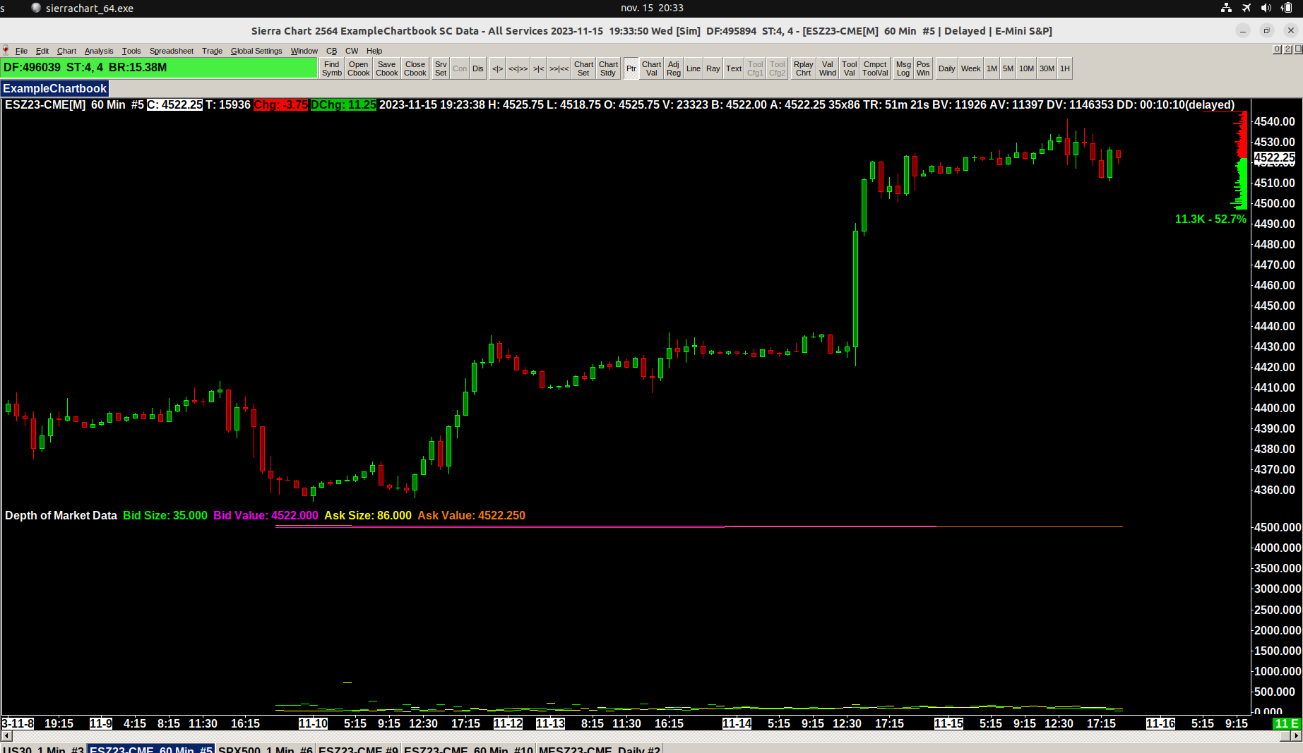 Thanks for your answer, I managed to get ESZ23-CME with the order book and DOM (see screenshot enclosed). however I didn' manage to display the display the heatmap/market depth on the chart. I have followed those steps without success: Market Depth Historical Graph: Step by Step Instructions I cannot believe this tool is so complex to use, when you open Bookmap, you direcly have the heatmap, no need to do anything... Date Time Of Last Edit: 2023-11-15 11:13:03