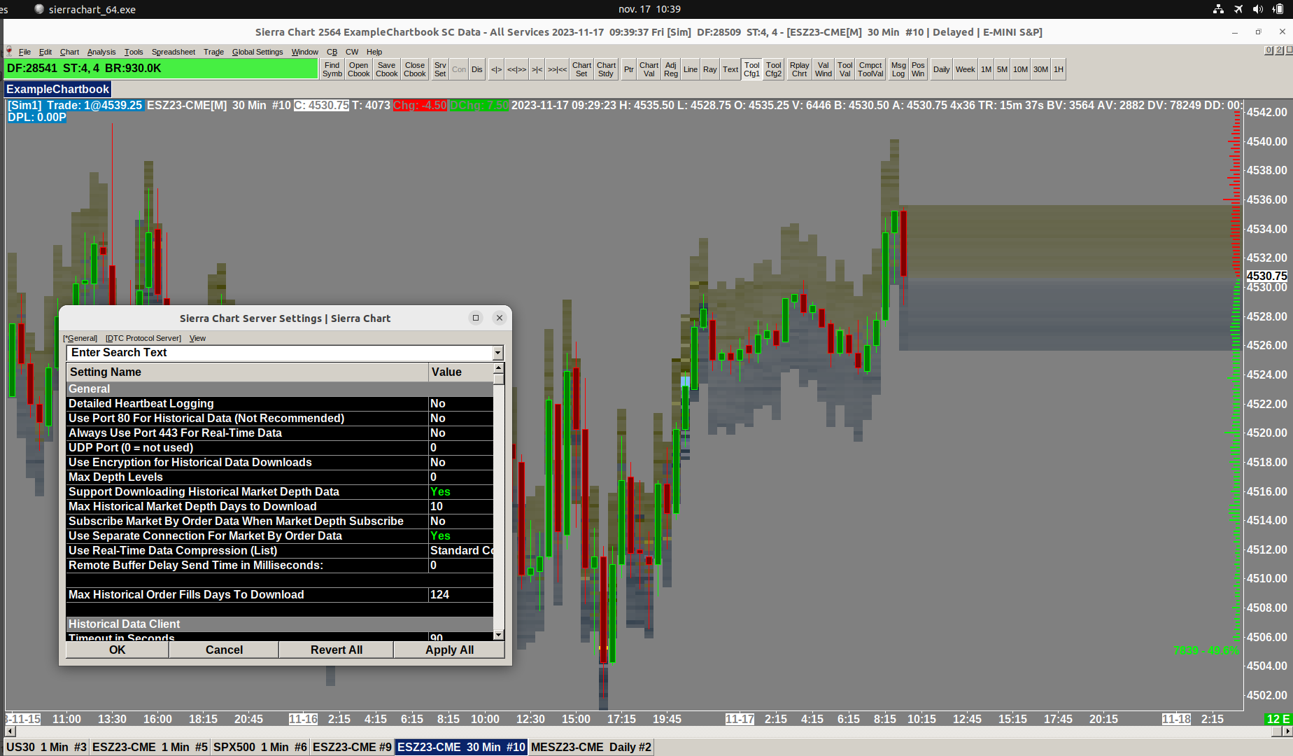 For testing use one of the futures symbols: Sierra Chart Trial Account: Introduction Do not use any CFD symbols. The Market Depth Historical Graph is not going to work with those symbols. Use: MESZ23-CME Sierra Chart Support - Engineering Level Your definitive source for support. Other responses are from users. Try to keep your questions brief and to the point. Be aware of support policy: https://www.sierrachart.com/index.php?l=PostingInformation.php#GeneralInformation For the most reliable, advanced, and zero cost futures order routing, use the Teton service: Sierra Chart Teton Futures Order Routing Date Time Of Last Edit: 2023-11-13 18:24:52