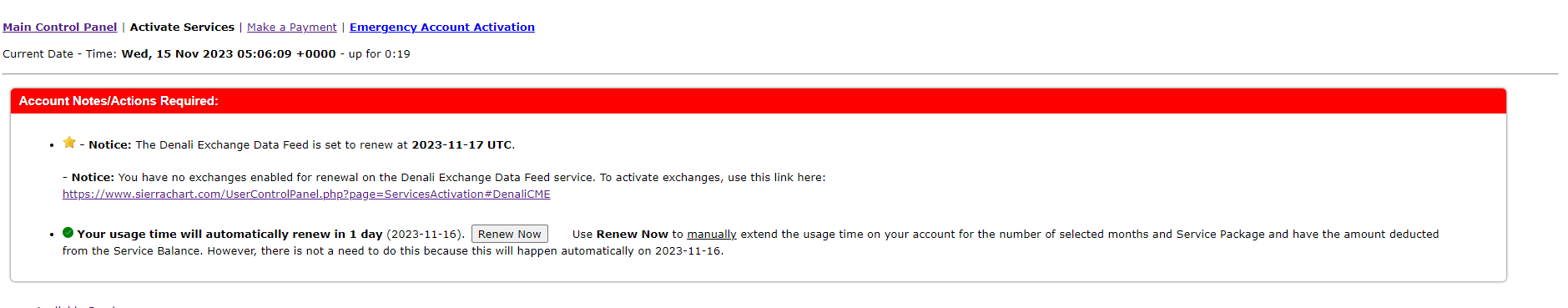 Only exchange fees renew at the beginning of the month. Your Service Package which includes the Denali Data Feed will renew on November 16.
