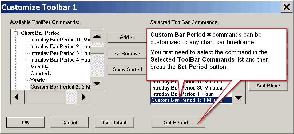 After adding the Custom Bar Period ToolBar command to the Selected ToolBar Command list, you then need to select it in that list and then you can press the Set Period button to customize it.