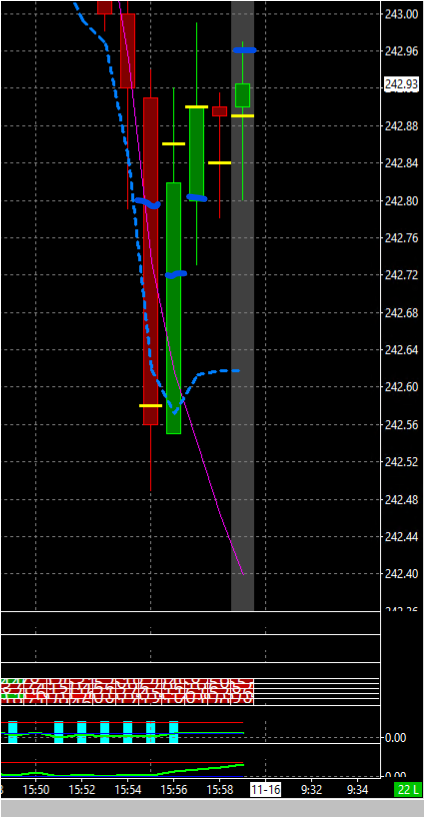 hello, i'm using "volume point of control for bars" study to find POC at every bar. how can i get at the same bar the next maximum volume (the maximum volume which is before the really maximum volume)? for exa:in the pic i display the "volume point of control for bars" study by the yellow dash. in the last bar the vpoc is ~242.9$(and let suppose the volume there i 100K). and at the blue dash which i draw, (what i want to get automatically) at 249.96$ is the next maximum value at that bar (next max volume after the real vpoc, 90K). thank you. |
