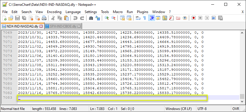 The candle stick of the current daily bar (historical data) is not showing correctly; s. picture 1 The open seems to be missing; s. picture 2. In the data file, the current data is missing at all; s. picture 3 This seems to be happening randomly. E.g. the chart of the SPX index was shown correctly that day. "Delete and download data" had helped the other day not yesterday though. Now/the next day the candle stick / data is ok. Please fix. |